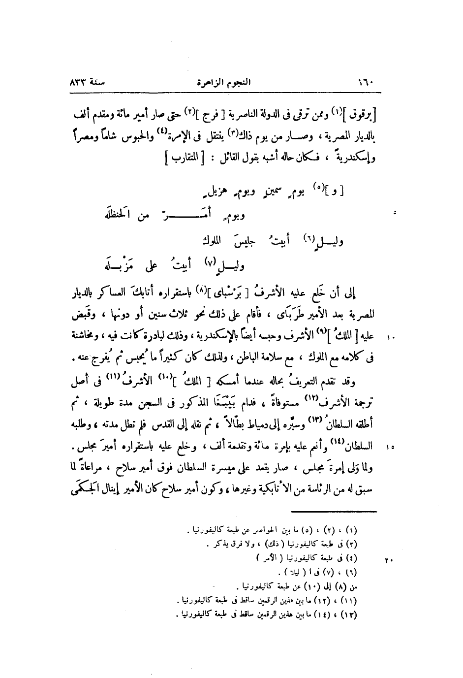 [برقوق] «1» وممن ترقى فى الدولة الناصرية [فرج] «2» حتى صار أمير مائة ومقدم ألف بالديار المصرية، وصار من يوم ذاك «3» ينتقل فى الإمرة «4» والحبوس شاما ومصرا وإسكندرية، فكان حاله أشبه بقول القائل: [المتقارب]