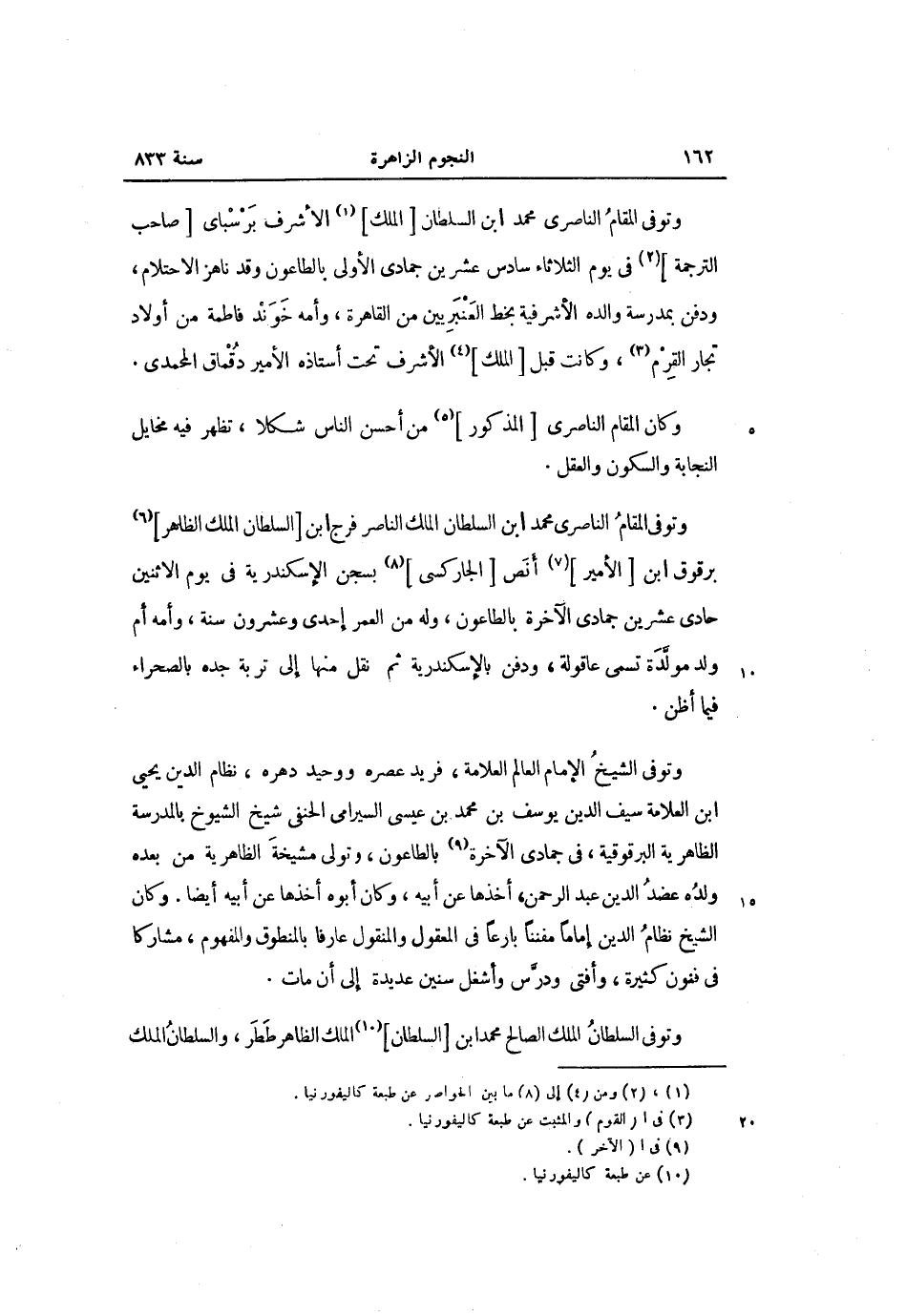 وتوفى المقام الناصرى محمد ابن السلطان [الملك] «1» الأشرف برسباى [صاحب الترجمة] «2» فى يوم الثلاثاء سادس عشرين جمادى الأولى بالطاعون وقد ناهز الاحتلام، ودفن بمدرسة والده الأشرفية بخط العنبريين من القاهرة، وأمه خوند فاطمة من أولاد تجار القرم «3» ، وكانت قبل [الملك] «4» الأشرف تحت أستاذه الأمير دقماق المحمدى.