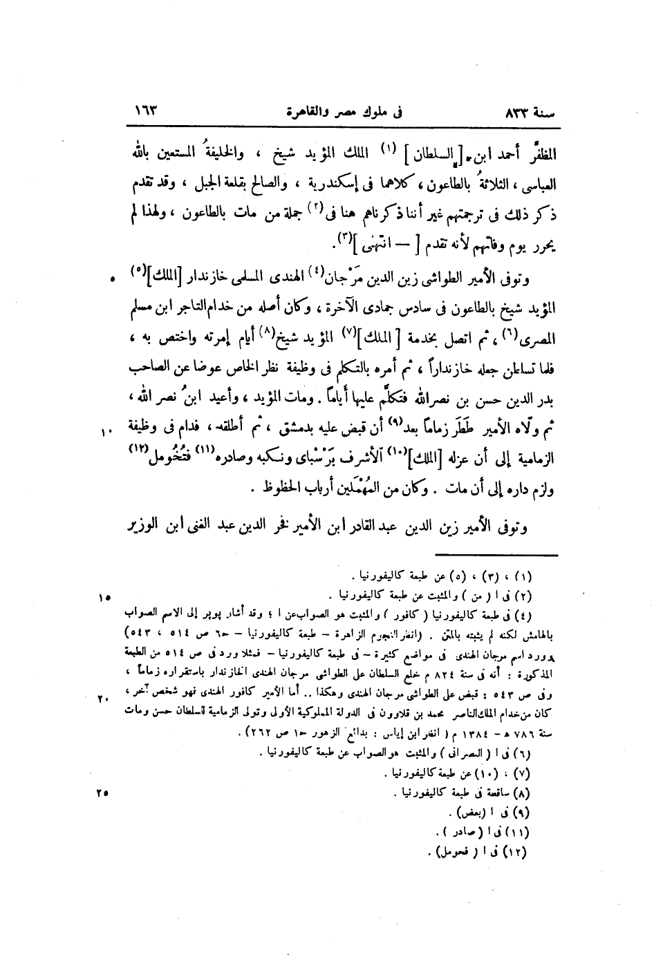 المظفّر أحمد ابن [السلطان] «1» الملك المؤيد شيخ، والخليفة المستعين بالله العباسى، الثلاثة بالطاعون، كلاهما فى إسكندرية، والصالح بقلعة الجبل، وقد تقدم ذكر ذلك فى ترجمتهم غير أننا ذكرناهم هنا فى «2» جملة من مات بالطاعون، ولهذا لم يحرر يوم وفاتهم لأنه تقدم [- انتهى] «3» .