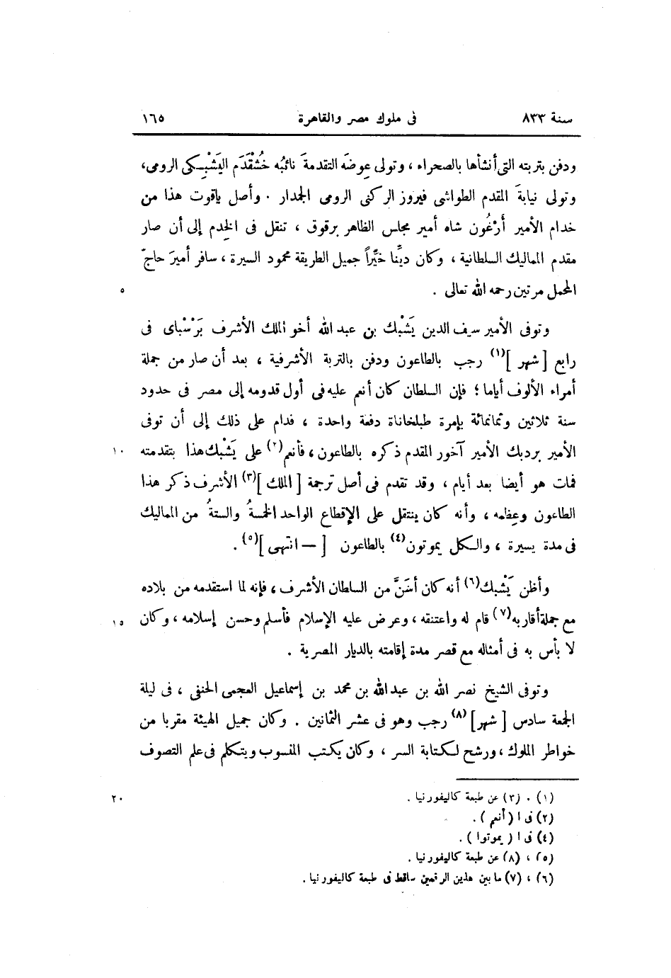 وتوفى الأمير سيف الدين يشبك بن عبد الله أخو الملك الأشرف برسباى فى رابع [شهر] «1» رجب بالطاعون ودفن بالتربة الأشرفية، بعد أن صار من جملة أمراء الألوف أياما؛ فإن السلطان كان أنعم عليه فى أول قدومه إلى مصر فى حدود سنة ثلاثين وثمانمائة بإمرة طبلخاناة دفعة واحدة، فدام على ذلك إلى أن توفى الأمير بردبك الأمير آخور المقدم ذكره بالطاعون، فأنعم «2» على يشبك هذا بتقدمته فمات هو أيضا بعد أيام، وقد تقدم فى أصل ترجمة [الملك] «3» الأشرف ذكر هذا الطاعون وعظمه، وأنه كان ينتقل على الإقطاع الواحد الخمسة والستة من المماليك فى مدة يسيرة، والكل يموتون «4» بالطاعون [- انتهى] «5» .