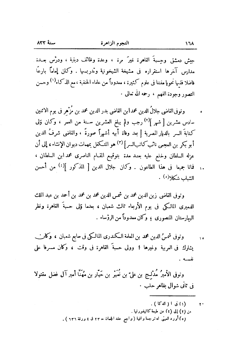 وتوفى القاضى جلال الدين محمد ابن القاضى بدر الدين محمد بن مزهر فى يوم الاثنين سادس عشرين [شهر] «2» رجب ولم يبلغ العشرين سنة من العمر، وكان ولى كتابة السر بالديار المصرية [بعد وفاة أبيه أشهرا صورة، والقاضى شرف الدين أبو بكر بن العجمى نائب كاتب السر] «3» هو المتكفل بمهمات ديوان الإنشاء، إلى أن عزله السلطان وخلع عليه بعد مدة بتوقيع المقام الناصرى محمد ابن السلطان، فماتا جميعا فى هذا الطاعون. وكان جلال الدين [المذكور] «4» من أحسن الشباب شكلا «5» .
