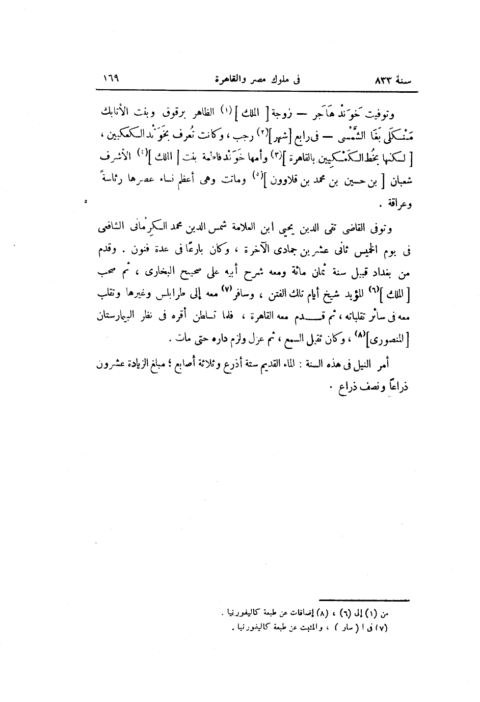 وتوفى القاضى تقي الدين يحيى ابن العلامة شمس الدين محمد الكرمانى الشافعى فى يوم الخميس ثانى عشرين جمادى الآخرة، وكان بارعا فى عدة فنون. وقدم من بغداد قبيل سنة ثمان مائة ومعه شرح أبيه على صحيح البخارى، ثم صحب [الملك] «6» المؤيد شيخ أيام تلك الفتن، وسافر «7» معه إلى طرابلس وغيرها وتقلب معه فى سائر تقلباته، ثم قدم معه القاهرة، فلما تسلطن أقره فى نظر البيمارستان [المنصورى] «8» ، وكان ثقيل السمع، ثم عزل ولزم داره حتى مات.