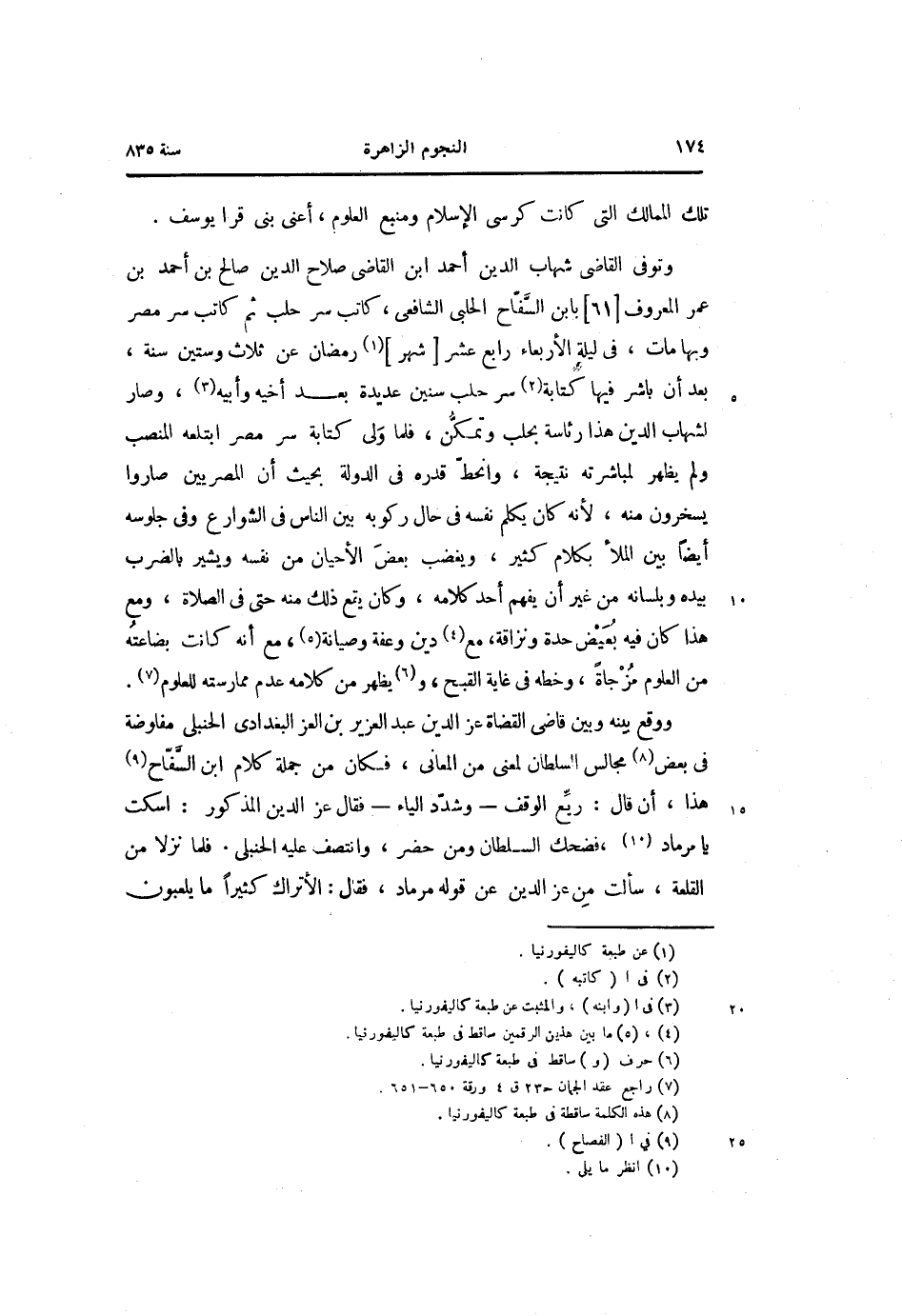 وتوفى القاضى شهاب الدين أحمد ابن القاضى صلاح الدين صالح بن أحمد بن عمر المعروف [61] بابن السّفّاح الحلبى الشافعى، كاتب سر حلب ثم كاتب سر مصر وبها مات، فى ليلة الأربعاء رابع عشر [شهر] «1» رمضان عن ثلاث وستين سنة، بعد أن باشر فيها كتابة «2» سر حلب سنين عديدة بعد أخيه وأبيه «3» ، وصار لشهاب الدين هذا رئاسة بحلب وتمكّن، فلما ولى كتابة سر مصر ابتلعه المنصب ولم يظهر لمباشرته نتيجة، وانحطّ قدره فى الدولة بحيث أن المصريين صاروا يسخرون منه، لأنه كان يكلم نفسه فى حال ركوبه بين الناس فى الشوارع وفى جلوسه أيضا بين الملأ بكلام كثير، ويغضب بعض الأحيان من نفسه ويشير بالضرب بيده وبلسانه من غير أن يفهم أحد كلامه، وكان يقع ذلك منه حتى فى الصلاة، ومع هذا كان فيه بعيض حدة ونزاقة، مع «4» دين وعفة وصيانة «5» ، مع أنه كانت بضاعته من العلوم مزجاة، وخطه فى غاية القبح، و «6» يظهر من كلامه عدم ممارسته للعلوم «7» .
