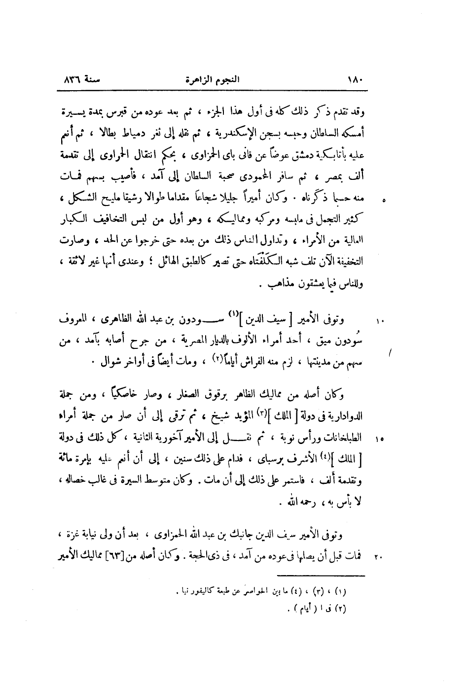 وتوفى الأمير [سيف الدين] «1» سودون بن عبد الله الظاهرى، المعروف سودون ميق، أحد أمراء الألوف بالديار المصرية، من جرح أصابه بآمد، من سهم من مدينتها، لزم منه الفراش أياما «2» ، ومات أيضا فى أواخر شوال.