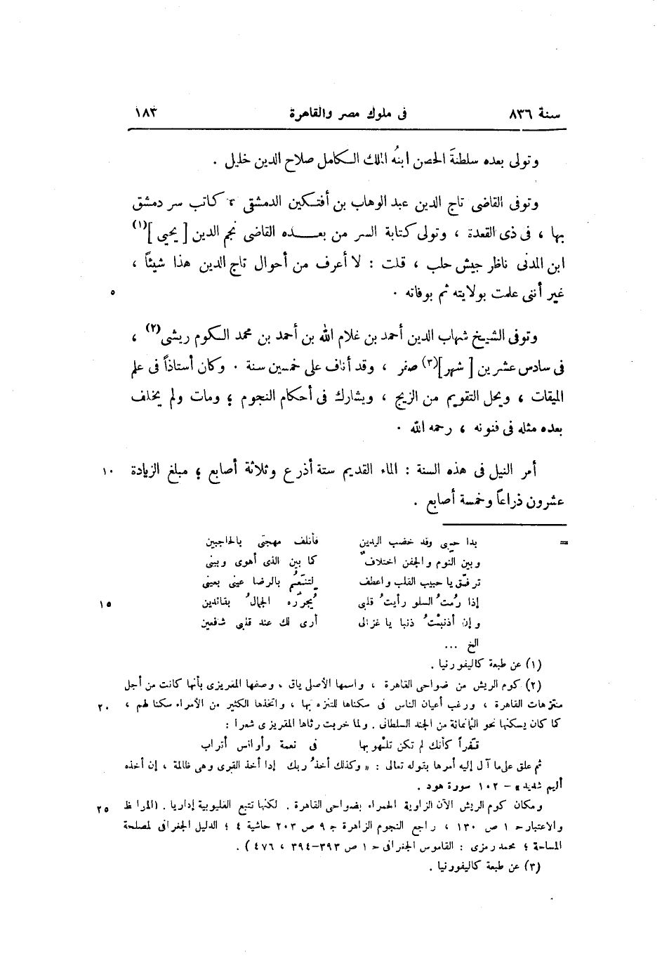 أمر النيل فى هذه السنة: الماء القديم ستة أذرع وثلاثة أصابع؛ مبلغ الزيادة عشرون ذراعا وخمسة أصابع.