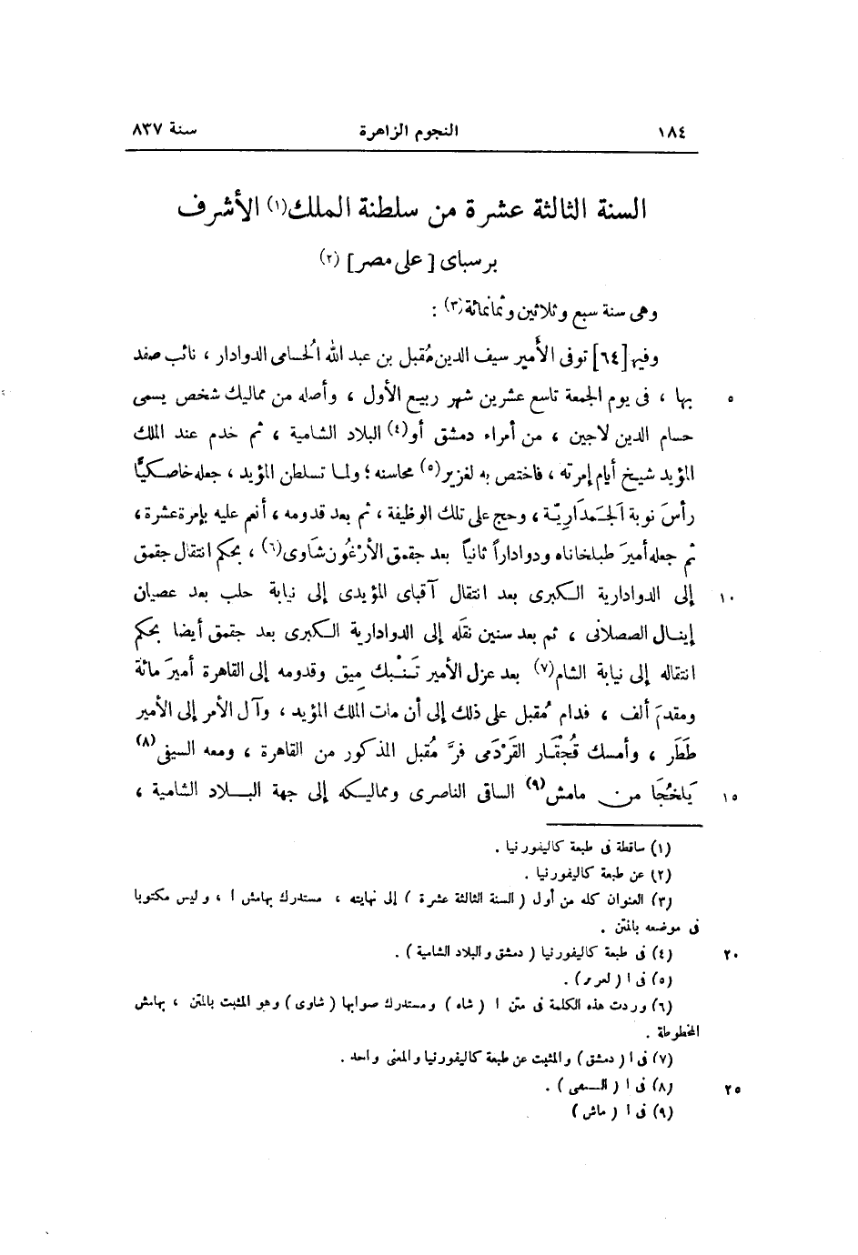 وفيه [64] توفى الأمير سيف الدين مقبل بن عبد الله الحسامى الدوادار، نائب صفد بها، فى يوم الجمعة تاسع عشرين شهر ربيع الأول، وأصله من مماليك شخص يسمى حسام الدين لاجين، من أمراء دمشق أو «4» البلاد الشامية، ثم خدم عند الملك المؤيد شيخ أيام إمرته، فاختص به لغزير «5» محاسنه؛ ولما تسلطن المؤيد، جعله خاصكيّا رأس نوبة الجمداريّة، وحج على تلك الوظيفة، ثم بعد قدومه، أنعم عليه بإمرة عشرة، ثم جعله أمير طبلخاناه ودوادارا ثانيا بعد جقمق الأرغون شاوى «6» ، بحكم انتقال جقمق إلى الدوادارية الكبرى بعد انتقال آقباى المؤيدى إلى نيابة حلب بعد عصيان إينال الصصلانى، ثم بعد سنين نقله إلى الدوادارية الكبرى بعد جقمق أيضا بحكم انتقاله إلى نيابة الشام «7» بعد عزل الأمير تنبك ميق وقدومه إلى القاهرة أمير مائة ومقدم ألف، فدام مقبل على ذلك إلى أن مات الملك المؤيد، وآل الأمر إلى الأمير ططر، وأمسك قجقار القردمى فرّ مقبل المذكور من القاهرة، ومعه السيفى «8» يلخجا من مامش «9» الساقى الناصرى ومماليكه إلى جهة البلاد الشامية،