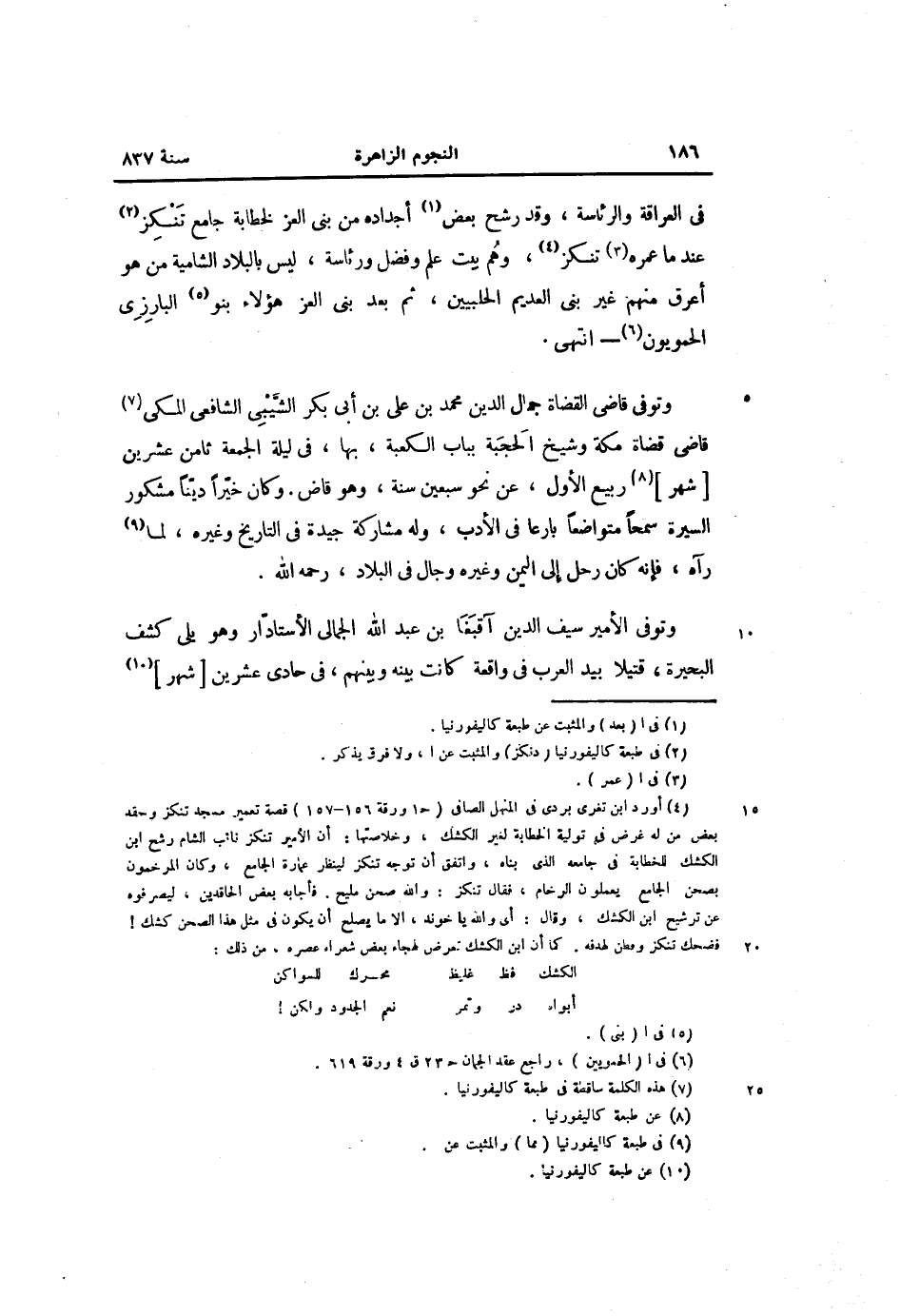 وتوفى قاضى القضاة جمال الدين محمد بن على بن أبى بكر الشّيبى الشافعى المكى «7» قاضى قضاة مكة وشيخ الحجبة بباب الكعبة، بها، فى ليلة الجمعة ثامن عشرين [شهر] «8» ربيع الأول، عن نحو سبعين سنة، وهو قاض. وكان خيّرا ديّنا مشكور السيرة سمحا متواضعا بارعا فى الأدب، وله مشاركة جيدة فى التاريخ وغيره، لما «9» رآه، فإنه كان رحل إلى اليمن وغيره وجال فى البلاد، رحمه الله.