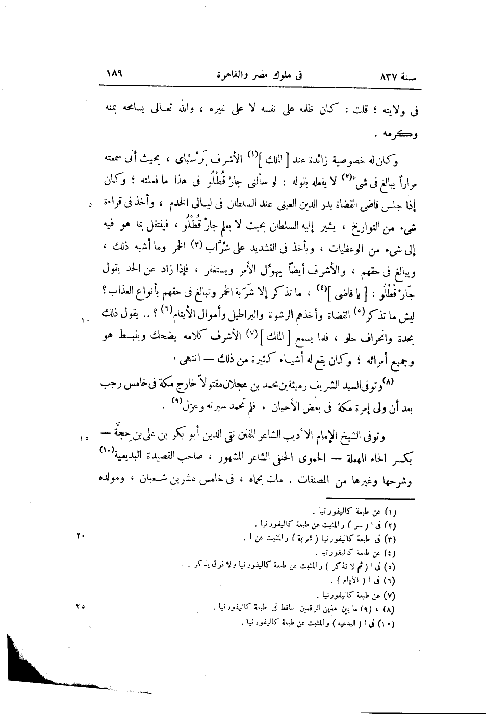 ليش ما تذكر «5» القضاة وأخذهم الرشوة والبراطيل وأموال الأيتام «6» ؟ ... يقول ذلك بحدة وانحراف حلو، فلما يسمع [الملك] «7» الأشرف كلامه يضحك وينبسط هو وجميع أمرائه؛ وكان يقع له أشياء كثيرة من ذلك- انتهى.