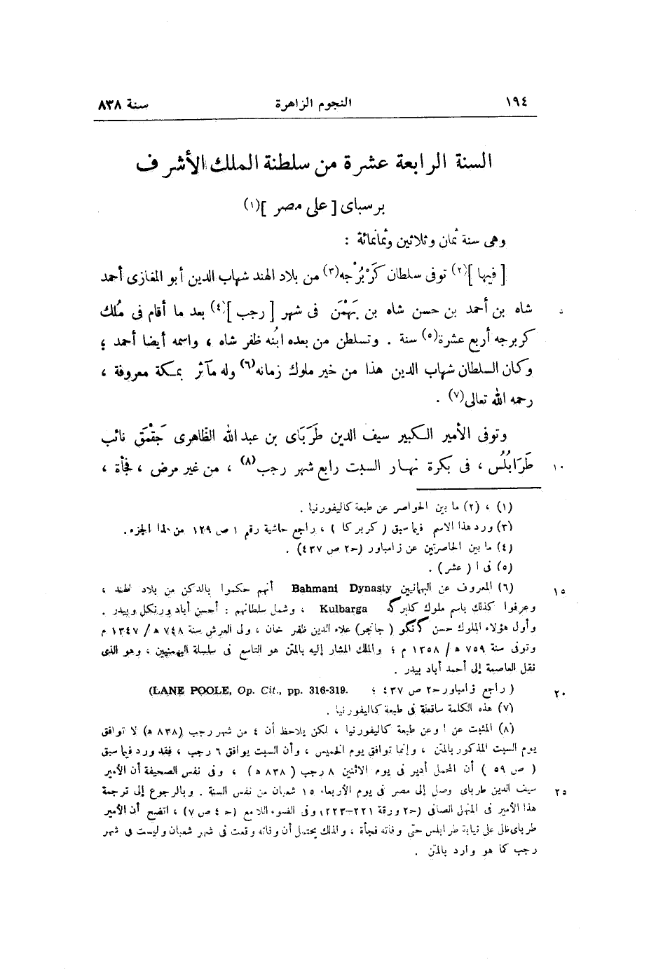 [فيها] «2» توفى سلطان كربرجه «3» من بلاد الهند شهاب الدين أبو المغازى أحمد شاه بن أحمد بن حسن شاه بن بهمن فى شهر [رجب] «4» بعد ما أقام فى ملك كربرجه أربع عشرة «5» سنة. وتسلطن من بعده ابنه ظفر شاه، واسمه أيضا أحمد؛ وكان السلطان شهاب الدين هذا من خير ملوك زمانه «6» وله مآثر بمكة معروفة، رحمه الله تعالى «7» .