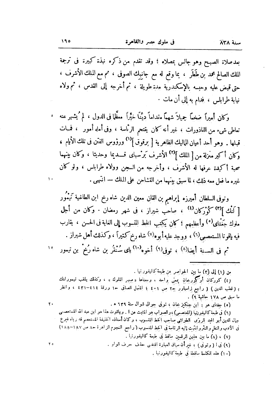 وتوفى السلطان أميرزه إبراهيم بن القان معين الدين شاه رخ ابن الطاغية تيمور [لنك] «3» كوركان «4» ، صاحب شيراز، فى شهر رمضان. وكان من أجل ملوك جغتاى «5» وأعظمهم؛ كان يكتب الخط المنسوب إلى الغاية فى الحسن، يقارب فيه ياقوتا المستعصمى «6» ، ووجد عليه أبوه «7» شاه رخ كثيرا، وكذلك أهل شيراز.