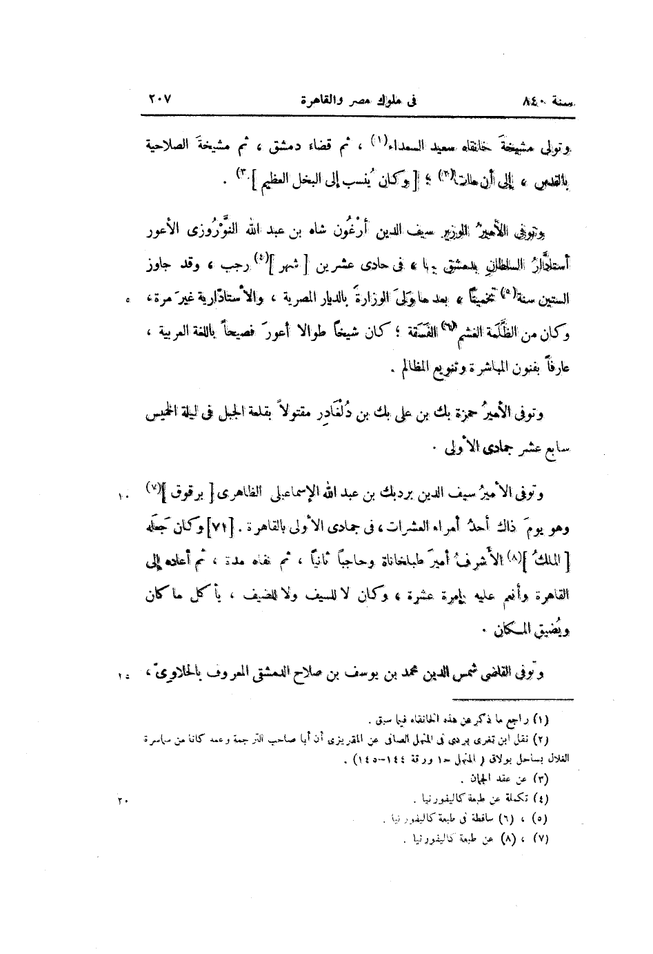 وتوفى الأمير الوزير سيف الدين أرغون شاه بن عبد الله النّوروزى الأعور أستادّار السلطان بدمشق بها، فى حادى عشرين [شهر] «4» رجب، وقد جاوز الستين سنة «5» تخمينا، بعد ما ولى الوزارة بالديار المصرية، والأستادّارية غير مرة، وكان من الظّلمة الغشم «6» الفسقة؛ كان شيخا طوالا أعور فصيحا باللغة العربية، عارفا بفنون المباشرة وتنويع المظالم.
