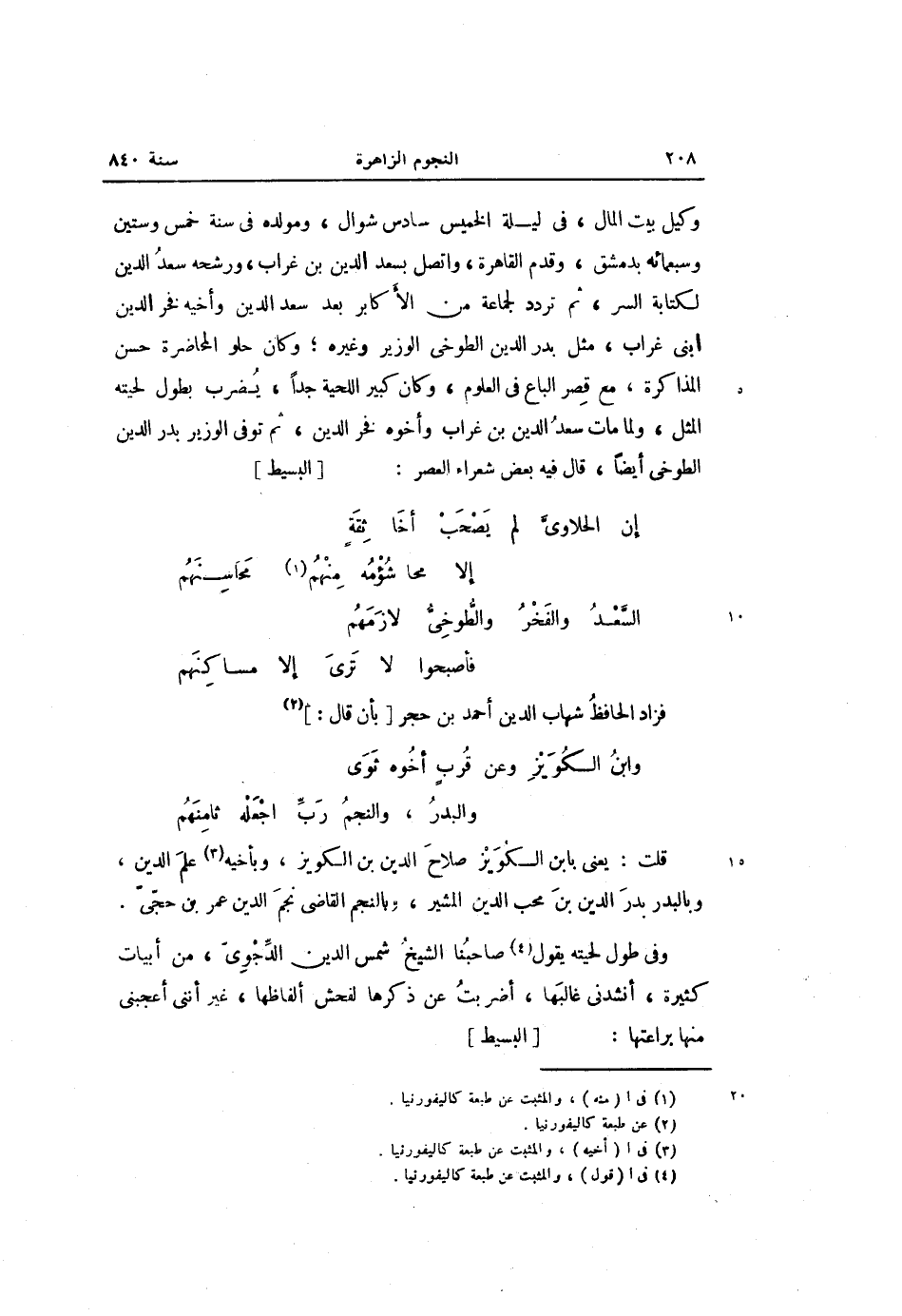 وكيل بيت المال، فى ليلة الخميس سادس شوال، ومولده فى سنة خمس وستين وسبعمائة بدمشق، وقدم القاهرة، واتصل بسعد الدين بن غراب، ورشحه سعد الدين لكتابة السر، ثم تردد لجماعة من الأكابر بعد سعد الدين وأخيه فخر الدين ابنى غراب، مثل بدر الدين الطوخى الوزير وغيره؛ وكان حلو المحاضرة حسن المذاكرة، مع قصر الباع فى العلوم، وكان كبير اللحية جدا، يضرب بطول لحيته المثل، ولما مات سعد الدين بن غراب وأخوه فخر الدين، ثم توفى الوزير بدر الدين الطوخى أيضا، قال فيه بعض شعراء العصر: [البسيط]