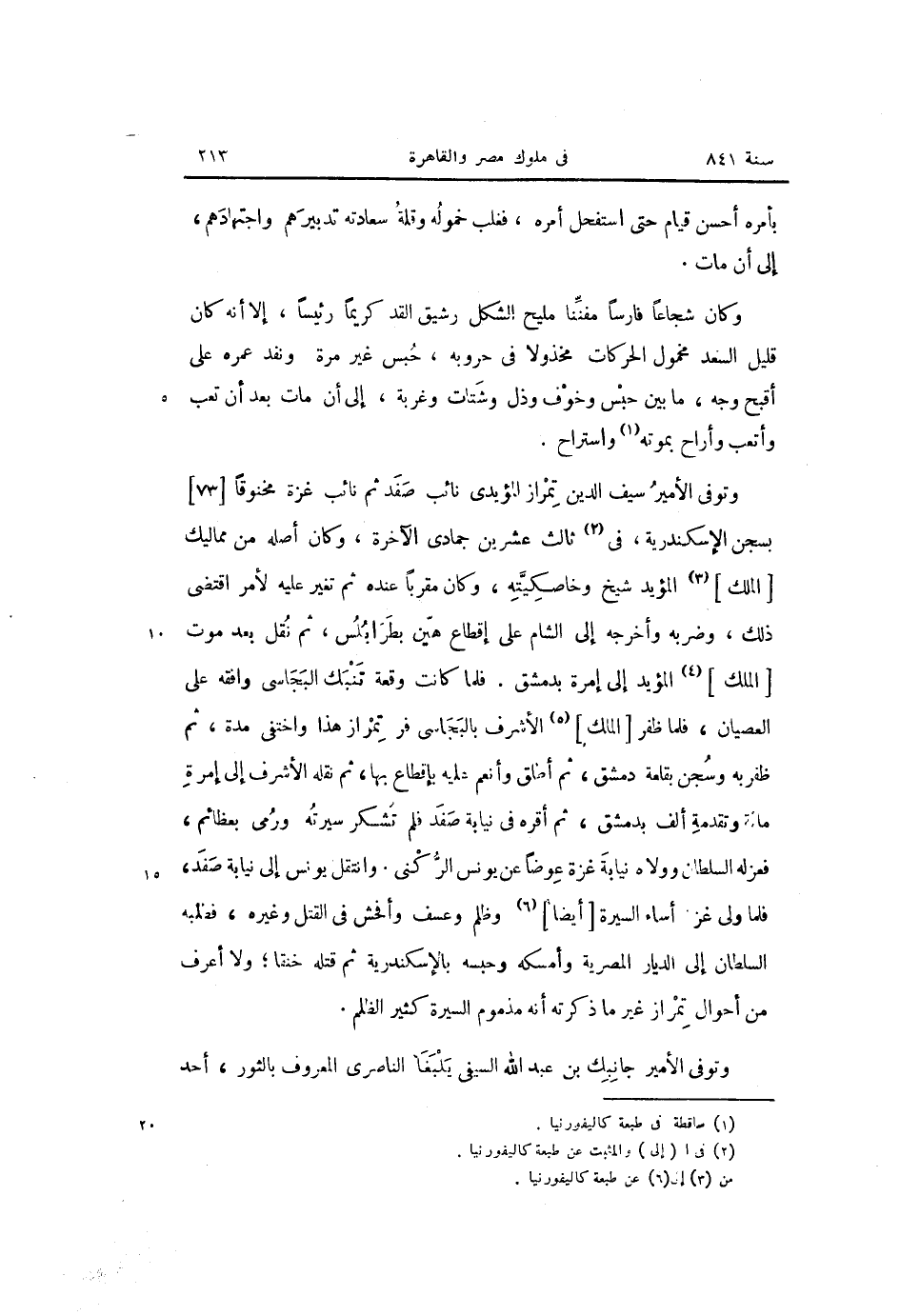 وتوفى الأمير سيف الدين تمراز المؤيدى نائب صفد ثم نائب غزة مخنوقا [73] بسجن الإسكندرية، فى «2» ثالث عشرين جمادى الآخرة، وكان أصله من مماليك [الملك] «3» المؤيد شيخ وخاصكيّته، وكان مقربا عنده ثم تغير عليه لأمر اقتضى ذلك، وضربه وأخرجه إلى الشام على إقطاع هيّن بطرابلس، ثم نقل بعد موت [الملك] «4» المؤيد إلى إمرة بدمشق. فلما كانت وقعة تنبك البجاسى وافقه على العصيان، فلما ظفر [الملك] «5» الأشرف بالبجاسى فر تمراز هذا واختفى مدة، ثم ظفر به وسجن بقلعة دمشق، ثم أطلق وأنعم عليه بإقطاع بها، ثم نقله الأشرف إلى إمرة مائة وتقدمة ألف بدمشق، ثم أقره فى نيابة صفد فلم تشكر سيرته ورمى بعظائم، فعزله السلطان وولاه نيابة غزة عوضا عن يونس الرّكنى. وانتقل يونس إلى نيابة صفد، فلما ولى غز أساء السيرة [أيضا] «6» وظلم وعسف وأفحش فى القتل وغيره، فطلبه السلطان إلى الديار المصرية وأمسكه وحبسه بالإسكندرية ثم قتله خنقا؛ ولا أعرف من أحوال تمراز غير ما ذكرته أنه مذموم السيرة كثير الظلم.