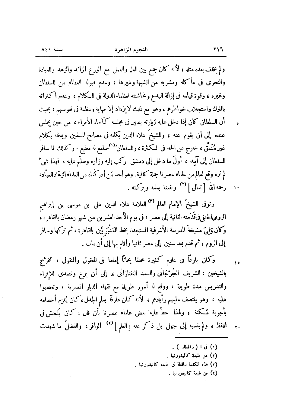 وتوفى الشيخ الإمام العالم «3» العلامة علاء الدين على بن موسى بن إبراهيم الرومى الحنفى فى قدمته الثانية إلى مصر، فى يوم الأحد العشرين من شهر رمضان بالقاهرة، وكان ولى مشيخة المدرسة الأشرفية المستجدة بخط العنبريّين بالقاهرة، ثم تركها وسافر إلى الروم، ثم قدم بعد سنين إلى مصر ثانيا وأقام بها إلى أن مات.