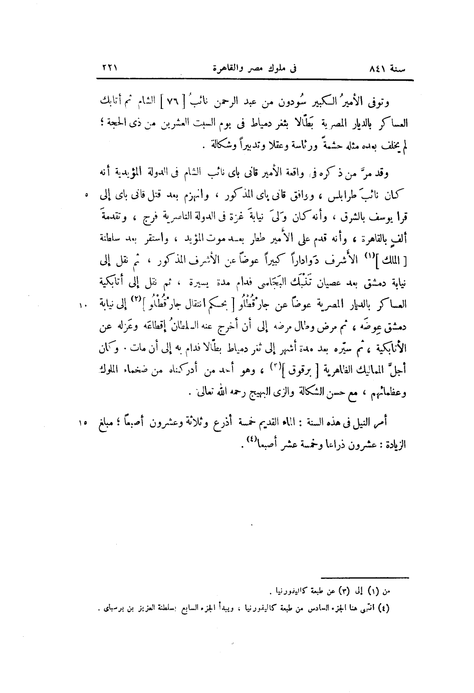 وتوفى الأمير الكبير سودون من عبد الرحمن نائب [76] الشام ثم أتابك العساكر بالديار المصرية بطّالا بثغر دمياط فى يوم السبت العشرين من ذى الحجة؛ لم يخلف بعده مثله حشمة ورئاسة وعقلا وتدبيرا وشكالة.