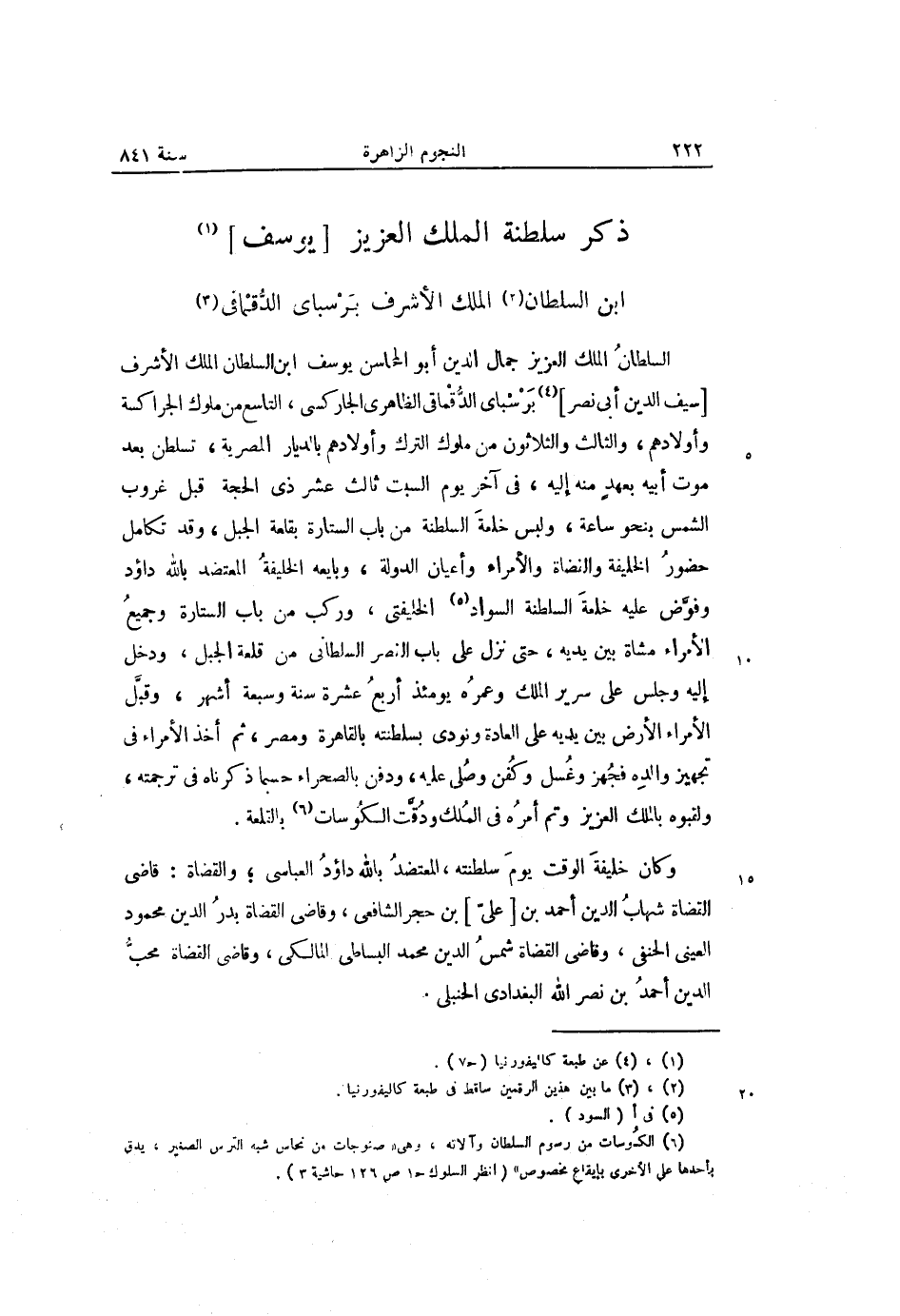 السلطان الملك العزيز جمال الدين أبو المحاسن يوسف ابن السلطان الملك الأشرف [سيف الدين أبى نصر] «4» برسباى الدّقماقى الظاهرى الجاركسى، التاسع من ملوك الجراكسة وأولادهم، والثالث والثلاثون من ملوك الترك وأولادهم بالديار المصرية، تسلطن بعد موت أبيه بعهد منه إليه، فى آخر يوم السبت ثالث عشر ذى الحجة قبل غروب الشمس بنحو ساعة، ولبس خلعة السلطنة من باب الستارة بقلعة الجبل، وقد تكامل حضور الخليفة والفضاة والأمراء وأعيان الدولة، وبايعه الخليفة المعتضد بالله داؤد وفوّض عليه خلعة السلطنة السواد «5» الخليفتى، وركب من باب الستارة وجميع الأمراء مشاة بين يديه، حتى نزل على باب النصر السلطانى من قلعة الجبل، ودخل إليه وجلس على سرير الملك وعمره يومئذ أربع عشرة سنة وسبعة أشهر، وقبّل الأمراء الأرض بين يديه على العادة ونودى بسلطنته بالقاهرة ومصر، ثم أخذ الأمراء فى تجهيز والده فجهز وغسل وكفن وصلى عليه، ودفن بالصحراء حسبما ذكرناه فى ترجمته، ولقبوه بالملك العزيز وتم أمره فى الملك ودقّت الكوسات «6» بالقلعة.