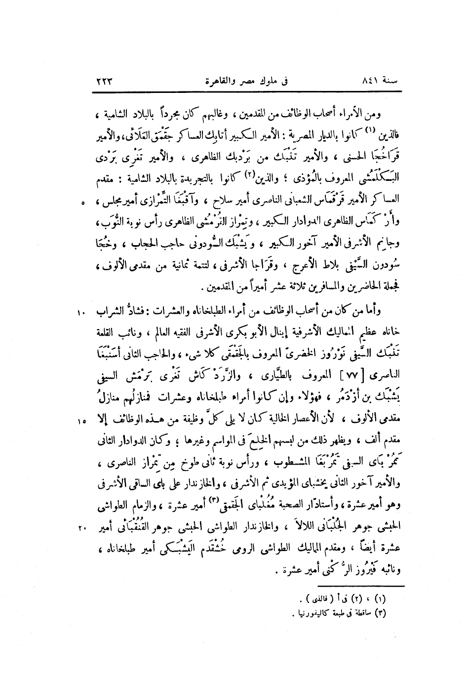وأما من كان من أصحاب الوظائف من أمراء الطبلخاناه والعشرات: فشادّ الشراب خاناه عظيم المماليك الأشرفية إينال الأبوبكريّ الأشرفى الفقيه العالم، ونائب القلعة تنبك السّيفى نوروز الخضرىّ المعروف بالجقمقى كلا شىء، والحاجب الثانى أسنبغا الناصرى [77] المعروف بالطيّارى، والزّرد كاش تغرى برمش السيفى يشبك بن أزدمر، فهؤلاء وإن كانوا أمراء طبلخاناه وعشرات فمنازلهم منازل مقدمى الألوف، لأن الأعصار الخالية كان لا يلى كلّ وظيفة من هذه الوظائف إلا مقدم ألف، ويظهر ذلك من لبسهم الخلع فى المواسم وغيرها؛ وكان الدوادار الثانى تمر باى السيفى تمربغا المشطوب، ورأس نوبة ثانى طوخ من تمراز الناصرى، والأمير آخور الثانى يخشباى المؤيدى ثم الأشرفى، والخازندار على باى الساقى الأشرفى وهو أمير عشرة، وأستادّار الصحبة مغلباى الجقمقى «3» أمير عشرة، والزمام الطواشى الحبشى جوهر الجلبانى اللالا، والخازندار الطواشى الحبشى جوهر القنقبائى أمير عشرة أيضا، ومقدم المماليك الطواشى الرومى خشقدم اليشبكى أمير طبلخاناه، ونائبه فيروز الرّكنى أمير عشرة.