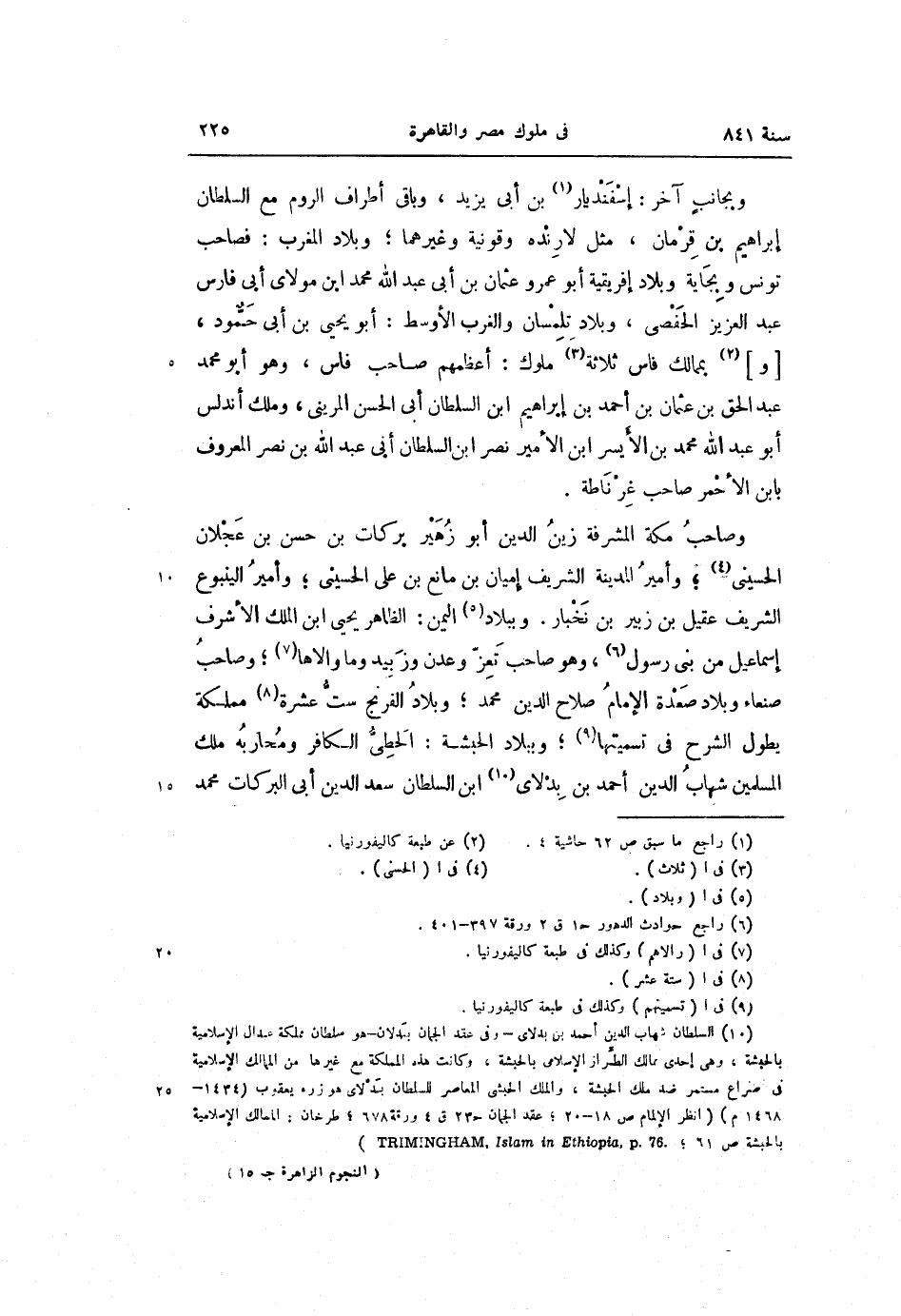 وبجانب آخر: إسفنديار «1» بن أبى يزيد، وباقى أطراف الروم مع السلطان إبراهيم بن قرمان، مثل لارنده وقونية وغيرهما؛ وبلاد المغرب: فصاحب تونس وبجاية وبلاد إفريقية أبو عمرو عثمان بن أبى عبد الله محمد ابن مولاى أبى فارس عبد العزيز الحفصى، وبلاد تلمسان والغرب الأوسط: أبو يحيى بن أبى حمّود، [و] «2» بممالك فاس ثلاثة «3» ملوك: أعظمهم صاحب فاس، وهو أبو محمد عبد الحق بن عثمان بن أحمد بن إبراهيم ابن السلطان أبى الحسن المرينى، وملك أندلس أبو عبد الله محمد بن الأيسر ابن الأمير نصر ابن السلطان أبى عبد الله بن نصر المعروف بابن الأحمر صاحب غرناطة.
