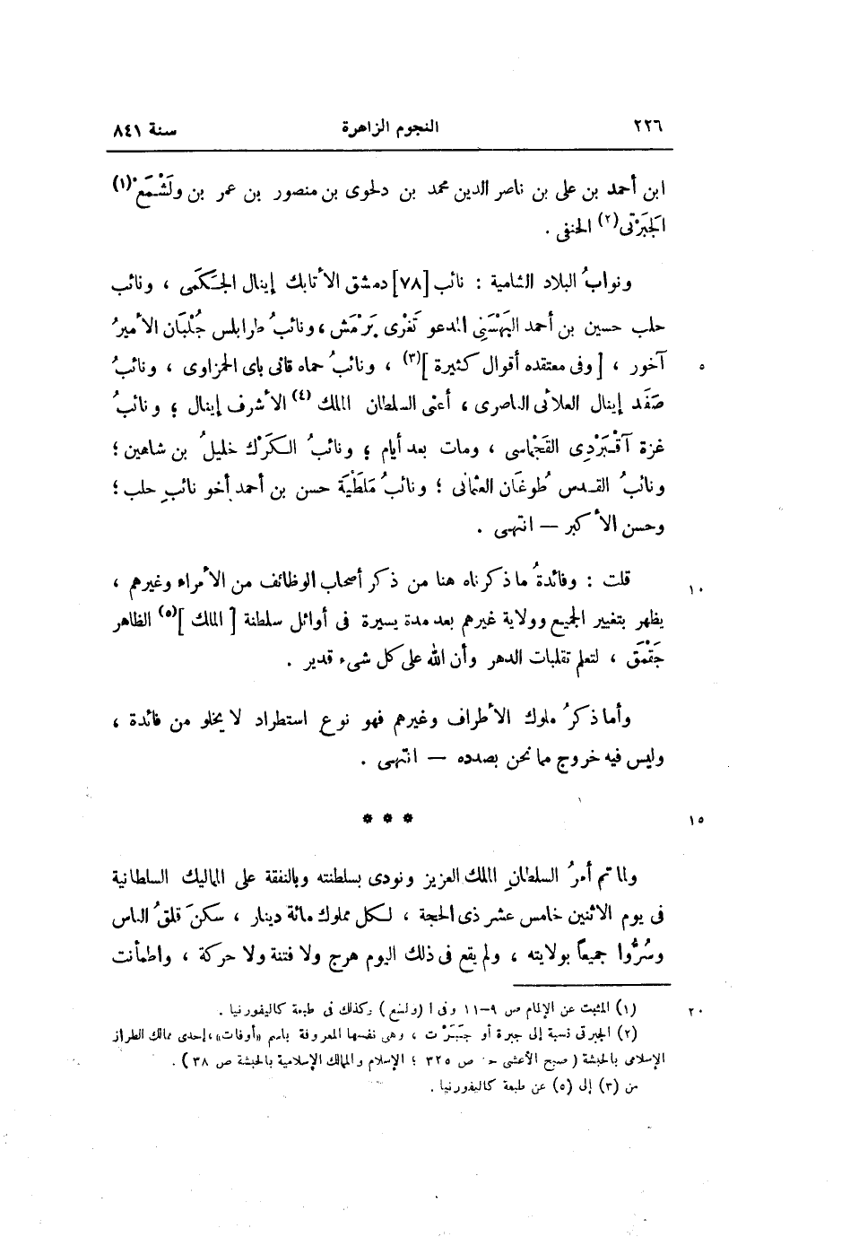 ونواب البلاد الشامية: نائب [78] دمشق الأتابك إينال الجكمى، ونائب حلب حسين بن أحمد البهسنى المدعو تغرى برمش، ونائب طرابلس جلبان الأمير آخور، [وفى معتقده أقوال كثيرة] «3» ، ونائب حماه قانى باى الحمزاوى، ونائب صفد إينال العلائى الناصرى، أعنى السلطان الملك «4» الأشرف إينال؛ ونائب غزة آقبردى القجماسى، ومات بعد أيام؛ ونائب الكرك خليل بن شاهين؛ ونائب القدس طوغان العثمانى؛ ونائب ملطية حسن بن أحمد أخو نائب حلب؛ وحسن الأكبر- انتهى.