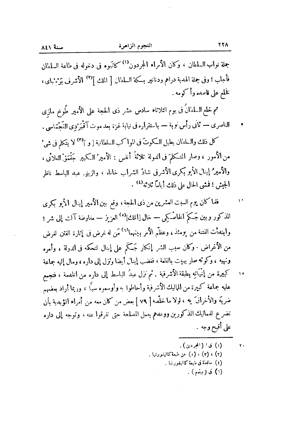 فلما كان يوم السبت العشرين من ذى الحجة، وقع بين الأمير إينال الأبوبكرى المذكور وبين جكم الخاصكى- خال [الملك] «5» العزيز- مفاوضة آلت إلى شر؛ وابتدأت الفتنة من يومئذ، وعظّم الأمر بينهما «6» من له غرض فى إثارة الفتن لغرض من الأغراض. وكان سبب الشر إنكار جكم على إينال لتحكمه فى الدولة، وأمره ونهيه، وكونه صار يبيت بالقلعة، فغضب إينال أيضا ونزل إلى داره، ومال إليه جماعة كبيرة من إنياته بطبقة الأشرفية. ثم نزل عبد الباسط إلى داره من الخدمة، فتجمع عليه جماعة كبيرة من المماليك الأشرفية وأحاطوا به وأوسعوه سبّا، وربما أراد بعضهم ضربه والأخراق به، لولا ما خلّصه [79] بعض من كان معه من أمراء المؤيدية بأن تضرع للمماليك المذكورين ووعدهم بعمل المصلحة حتى تفرقوا عنه، وتوجه إلى داره على أقبح وجه.