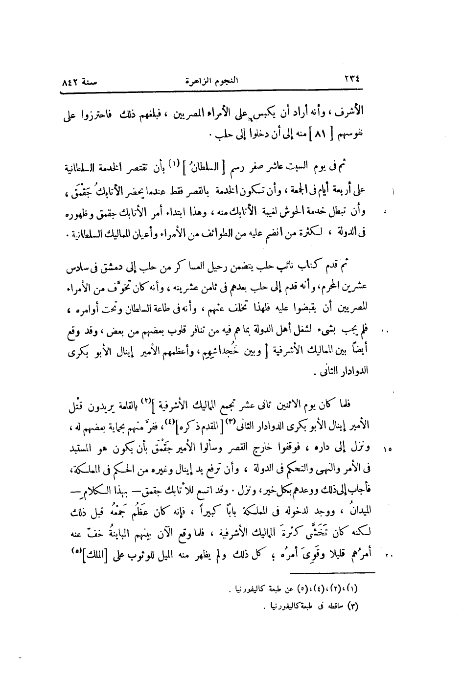 ثم قدم كتاب نائب حلب يتضمن رحيل العساكر من حلب إلى دمشق فى سادس عشرين المحرم، وأنه قدم إلى حلب بعدهم فى ثامن عشرينه، وأنه كان تخوّف من الأمراء المصريين أن يقبضوا عليه فلهذا تخلف عنهم، وأنه فى طاعة السلطان وتحت أوامره، فلم يجب بشىء لشغل أهل الدولة بما هم فيه من تنافر قلوب بعضهم من بعض، وقد وقع أيضا بين المماليك الأشرفية [وبين خجداشهم، وأعظمهم الأمير إينال الأبوبكريّ الدوادار الثانى.