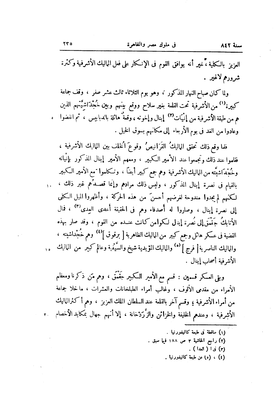 فلما وقع ذلك تحقق المماليك القرانيص وقوع الخلف بين المماليك الأشرفية، فقاموا عند ذلك وتجمعوا عند الأمير الكبير، ومعهم الأمير إينال المذكور بإنياته وخجداشيّته من المماليك الأشرفية وهم جمع كبير أيضا، وتكلموا مع الأمير الكبير بالقيام فى نصرة إينال المذكور، وليس ذلك مرادهم وإنما قصدهم غير ذلك، لكنهم لم يجدوا مندوحة لغرضهم أحسن من هذه الحركة، وأظهروا الميل الكلى إلى نصرة إينال، وصاروا له أصدقاء وهم فى الحقيقة أعدى العدى «3» ، فمال الأتابك جقمق إلى نصرة إينال لكوامن كانت عنده من القوم، وقد صار بهذه القضية فى عسكر هائل وجمع كبير من المماليك الظاهرية [برقوق] «4» وهم خجداشيته، والمماليك الناصرية [فرج] «5» والمماليك المؤيدية شيخ والسّيفية وعالم كبير من المماليك الأشرفية أصحاب إينال.