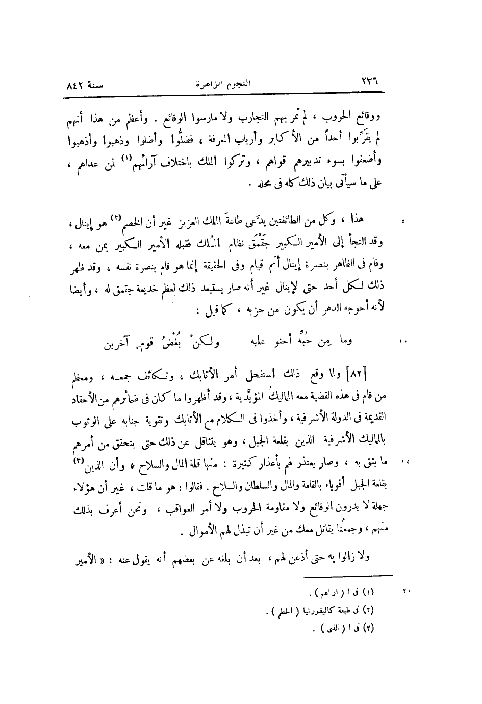 هذا، وكل من الطائفتين يدّعى طاعة الملك العزيز غير أن الخصم «2» هو إينال، وقد التجأ إلى الأمير الكبير جقمق نظام الملك فقبله الأمير الكبير بمن معه، وقام فى الظاهر بنصرة إينال أتم قيام وفى الحقيقة إنما هو قام بنصرة نفسه، وقد ظهر ذلك لكل أحد حتى لإينال غير أنه صار يستبعد ذلك لعظم خديعة جقمق له، وأيضا لأنه أحوجه الدهر أن يكون من حزبه، كما قيل: