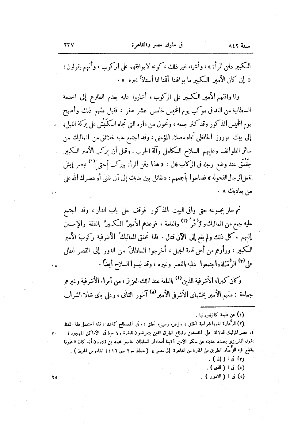 ولما وافقهم الأمير الكبير على الركوب، أشاروا عليه بعدم الطلوع إلى الخدمة السلطانية من الغد فى موكب يوم الخميس خامس عشر صفر، فقبل منهم ذلك وأصبح يوم الخميس المذكور وقد كثر جمعه، وتحول من داره التى تجاه الكبش على بركة الفيل، إلى بيت نوروز الحافظى تجاه مصلاة المؤمنى، وقد اجتمع عليه خلائق من المماليك من سائر الطوائف وعليهم السلاح الكامل وآلة الحرب. وقبل أن يركب الأمير الكبير جقمق عند وضع رجله فى الركاب قال: «هذا دقن المرأة بيركب [حتى] «1» نبصر إيش تفعل الرجال الفحوله» فصلحوا بأجمعهم: «نقاتل بين يديك إلى أن نفنى أو ينصرك الله على من يعاديك» .