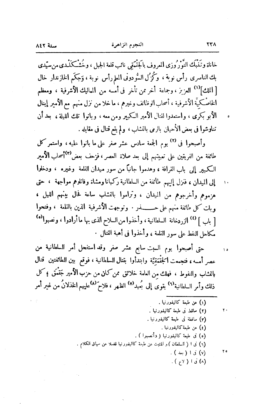 حتى أصبحوا يوم السبت سابع عشر صفر وقد استفحل أمر السلطانية من عصر أمسه، فتجمعت الجقمقيّة وابتدأوا بقتال السلطانية، فوقع بين الطائفتين قتال بالنشاب والنفوط، فهلك من العامة خلائق ممن كان من حزب الأمير جقمق؛ كل ذلك وأمر السلطانية «6» يقوى إلى بعيد «7» الظهر، فلاح «8» عليهم الخذلان من غير أمر