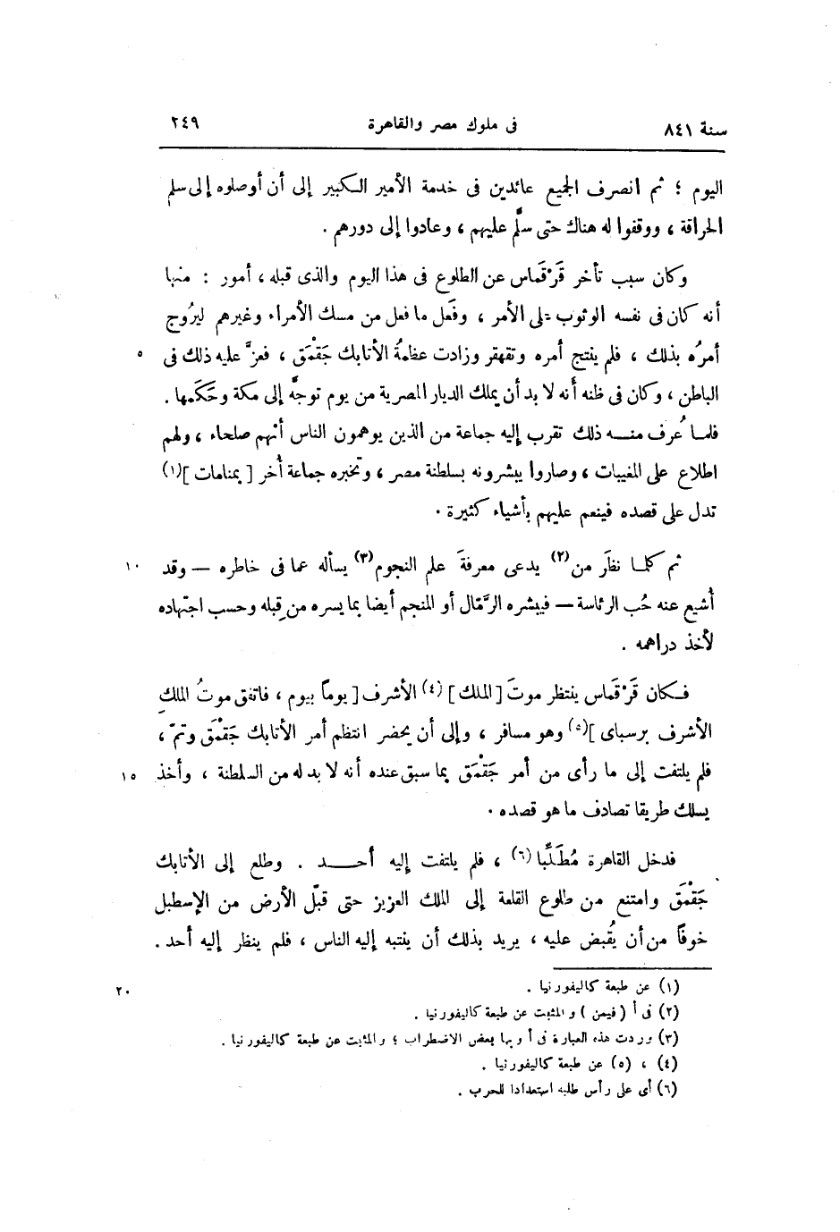 فكان قرقماس ينتظر موت [الملك] «4» الأشرف [يوما بيوم، فاتفق موت الملك الأشرف برسباى] «5» وهو مسافر، وإلى أن يحضر انتظم أمر الأتابك جقمق وتمّ، فلم يلتفت إلى ما رأى من أمر جقمق بما سبق عنده أنه لا بد له من السلطنة، وأخذ يسلك طريقا تصادف ما هو قصده.
