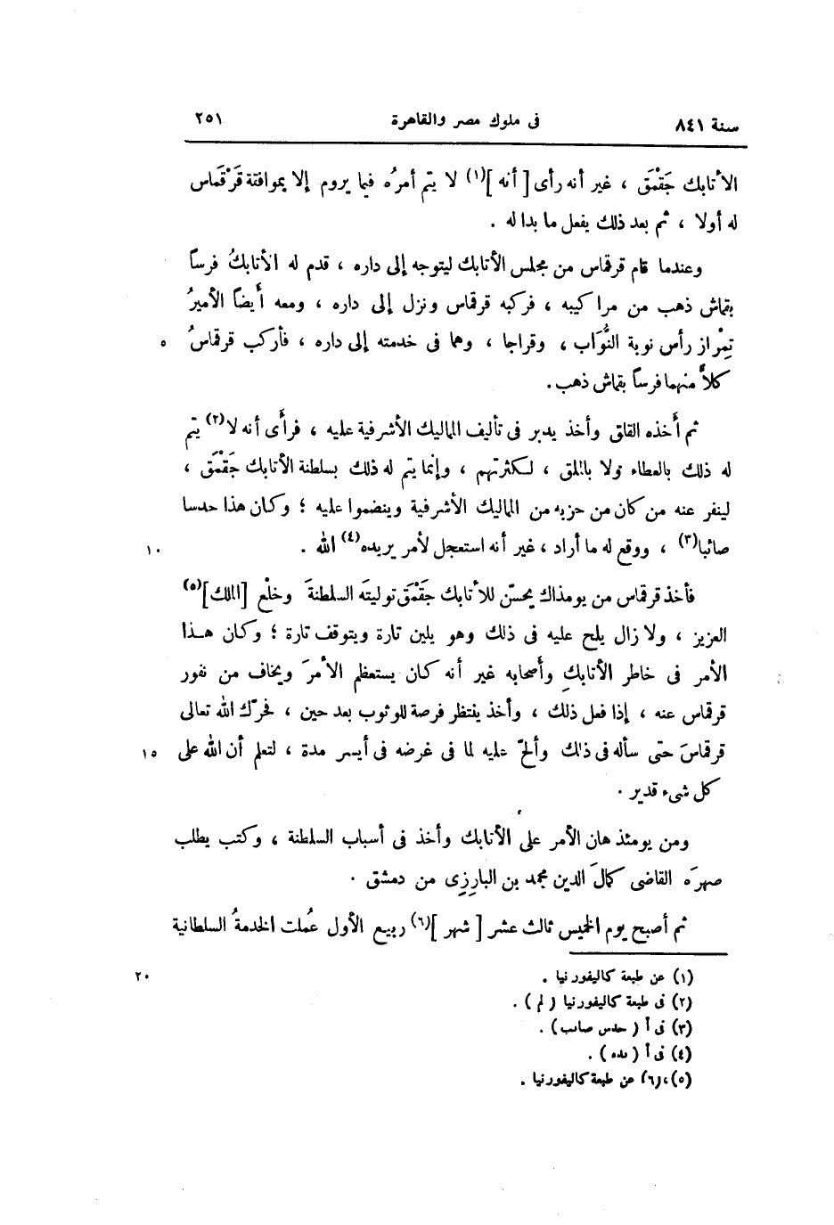 الأتابك جقمق، غير أنه رأى [أنه] «1» لا يتم أمره فيما يروم إلا بموافقة قرقماس له أولا، ثم بعد ذلك يفعل ما بدا له.
