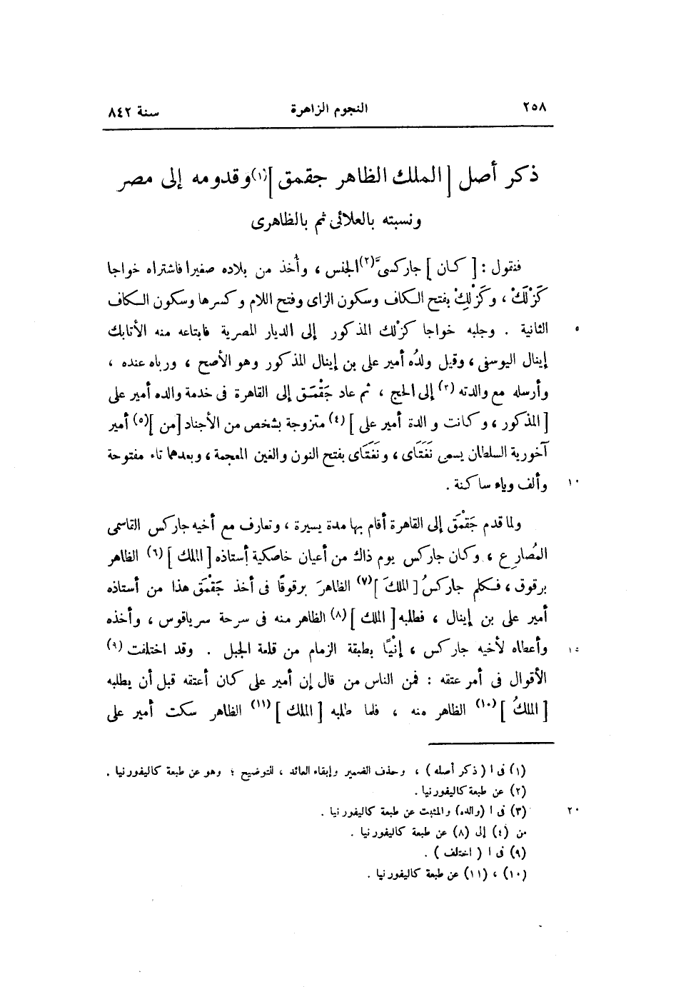 ولما قدم جقمق إلى القاهرة أقام بها مدة يسيرة، وتعارف مع أخيه جاركس القاسمى المصارع، وكان جاركس يوم ذاك من أعيان خاصكية أستاذه [الملك] «6» الظاهر برقوق، فكلم جاركس [الملك] «7» الظاهر برقوقا فى أخذ جقمق هذا من أستاذه أمير على بن إينال، فطلبه [الملك] «8» الظاهر منه فى سرحة سرياقوس، وأخذه وأعطاه لأخيه جاركس، إنيا بطبقة الزمام من قلعة الجبل. وقد اختلفت «9» الأقوال فى أمر عتقه: فمن الناس من قال إن أمير على كان أعتقه قبل أن يطلبه [الملك] «10» الظاهر منه، فلما طلبه [الملك] «11» الظاهر سكت أمير على