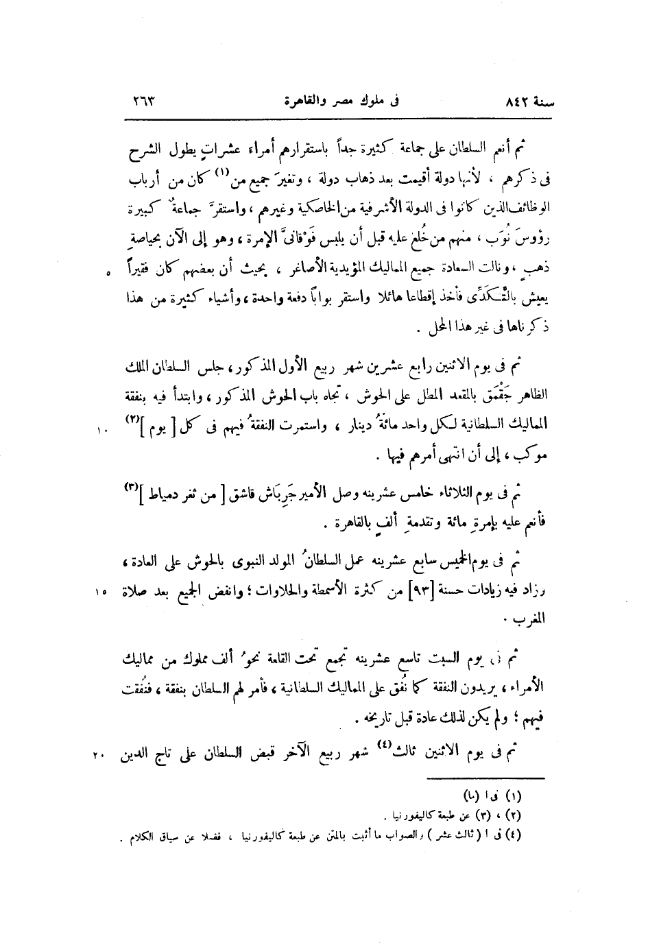ثم فى يوم الاثنين رابع عشرين شهر ربيع الأول المذكور، جلس السلطان الملك الظاهر جقمق بالمقعد المطل على الحوش، تجاه باب الحوش المذكور، وابتدأ فيه بنفقة المماليك السلطانية لكل واحد مائة دينار، واستمرت النفقة فيهم فى كل [يوم] «2» موكب، إلى أن انتهى أمرهم فيها.