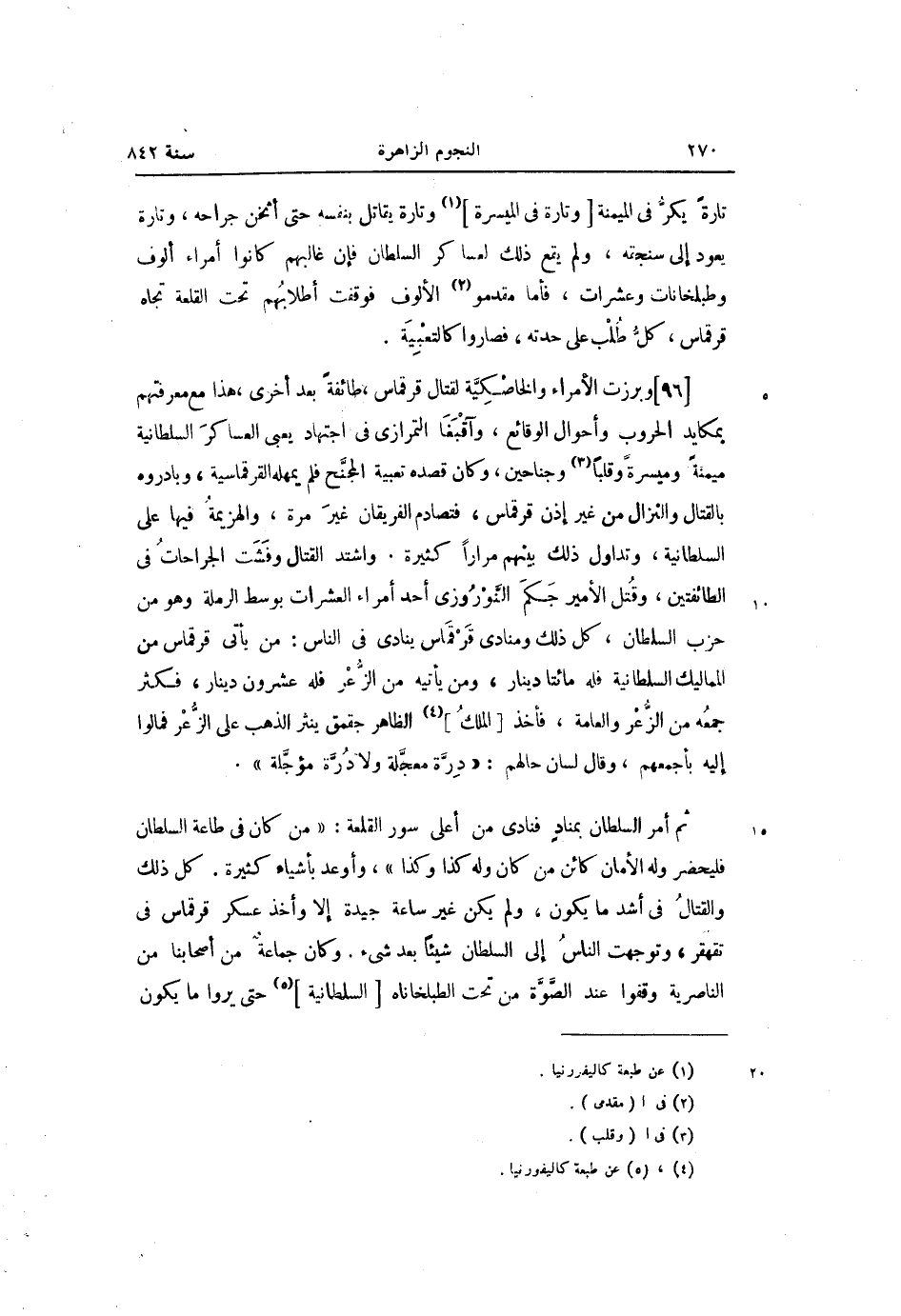 ثم أمر السلطان بمناد فنادى من أعلى سور القلعة: «من كان فى طاعة السلطان فليحضر وله الأمان كائن من كان وله كذا وكذا» ، وأوعد بأشياء كثيرة. كل ذلك والقتال فى أشد ما يكون، ولم يكن غير ساعة جيدة إلا وأخذ عسكر قرقماس فى تقهقر، وتوجهت الناس إلى السلطان شيئا بعد شىء. وكان جماعة من أصحابنا من الناصرية وقفوا عند الصّوّة من تحت الطبلخاناه [السلطانية] «5» حتى يروا ما يكون