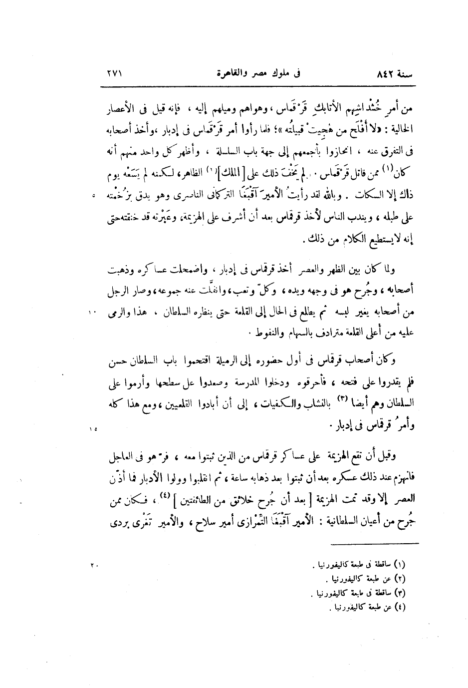 وقبل أن تقع الهزيمة على عساكر قرقماس من الذين ثبتوا معه، فرّهو فى العاجل فانهزم عند ذلك عسكره بعد أن ثبتوا بعد ذهابه ساعة، ثم انقلبوا وولوا الأدبار فما أذّن العصر إلا وقد تمت الهزيمة [بعد أن جرح خلائق من الطائفتين] «4» ، فكان ممن جرح من أعيان السلطانية: الأمير آقبغا التّمرازى أمير سلاح، والأمير تغرى بردى