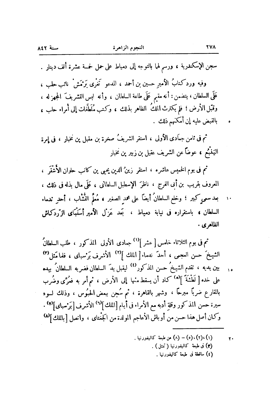 ثم فى يوم الثلاثاء خامس [عشر] «1» جمادى الأولى المذكور، طلب السلطان الشيخ حسن العجمى، أحد ندماء [الملك] «2» الأشرف برسباى، فلما مثل «3» بين يديه، تقدم الشيخ حسن المذكور «4» ليقبل يد السلطان فضربه السلطان بيده على خده [لطشة] «5» كاد أن يسقط منها إلى الأرض، ثم أمر به فعرّى وضرب بالمقارع ضربا مبرحا، وشهر بالقاهرة، ثم سجن ببعض الحبوس، وذلك لسوء سيرة حسن المذكور وقلة أدبه مع الأمراء فى أيام [الملك] «6» الأشرف [برسباى] «7» .