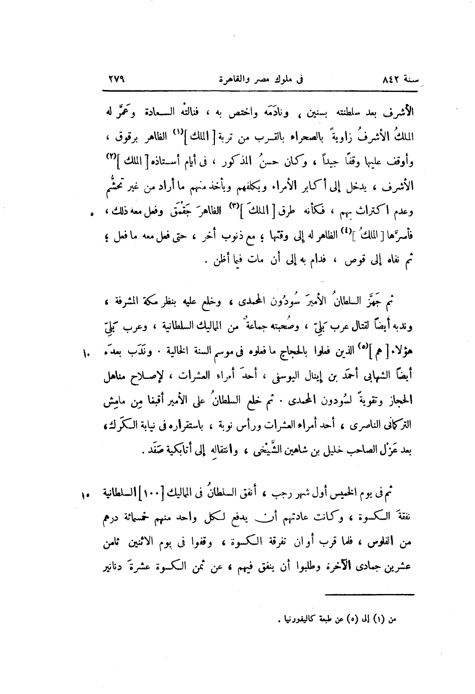 ثم فى يوم الخميس أول شهر رجب، أنفق السلطان فى المماليك [100] السلطانية نفقة الكسوة، وكانت عادتهم أن يدفع لكل واحد منهم خمسمائة درهم من الفلوس، فلما قرب أوان تفرقة الكسوة، وقفوا فى يوم الاثنين ثامن عشرين جمادى الآخرة وطلبوا أن ينفق فيهم، عن ثمن الكسوة عشرة دنانير