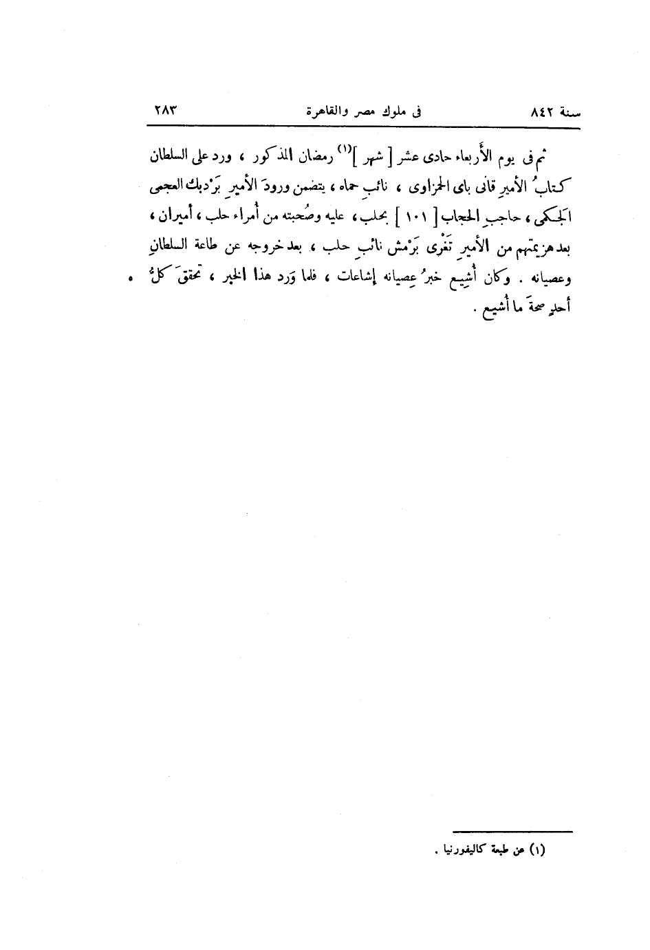 ثم فى يوم الأربعاء حادى عشر [شهر] «1» رمضان المذكور، ورد على السلطان كتاب الأمير قانى باى الحمزاوى، نائب حماه، يتضمن ورود الأمير بردبك العجمى الجكمى، حاجب الحجاب [101] بحلب، عليه وصحبته من أمراء حلب، أميران، بعد هزيمتهم من الأمير تغرى برمش نائب حلب، بعد خروجه عن طاعة السلطان وعصيانه. وكان أشيع خبر عصيانه إشاعات، فلما ورد هذا الخبر، تحقق كلّ أحد صحة ما أشيع.