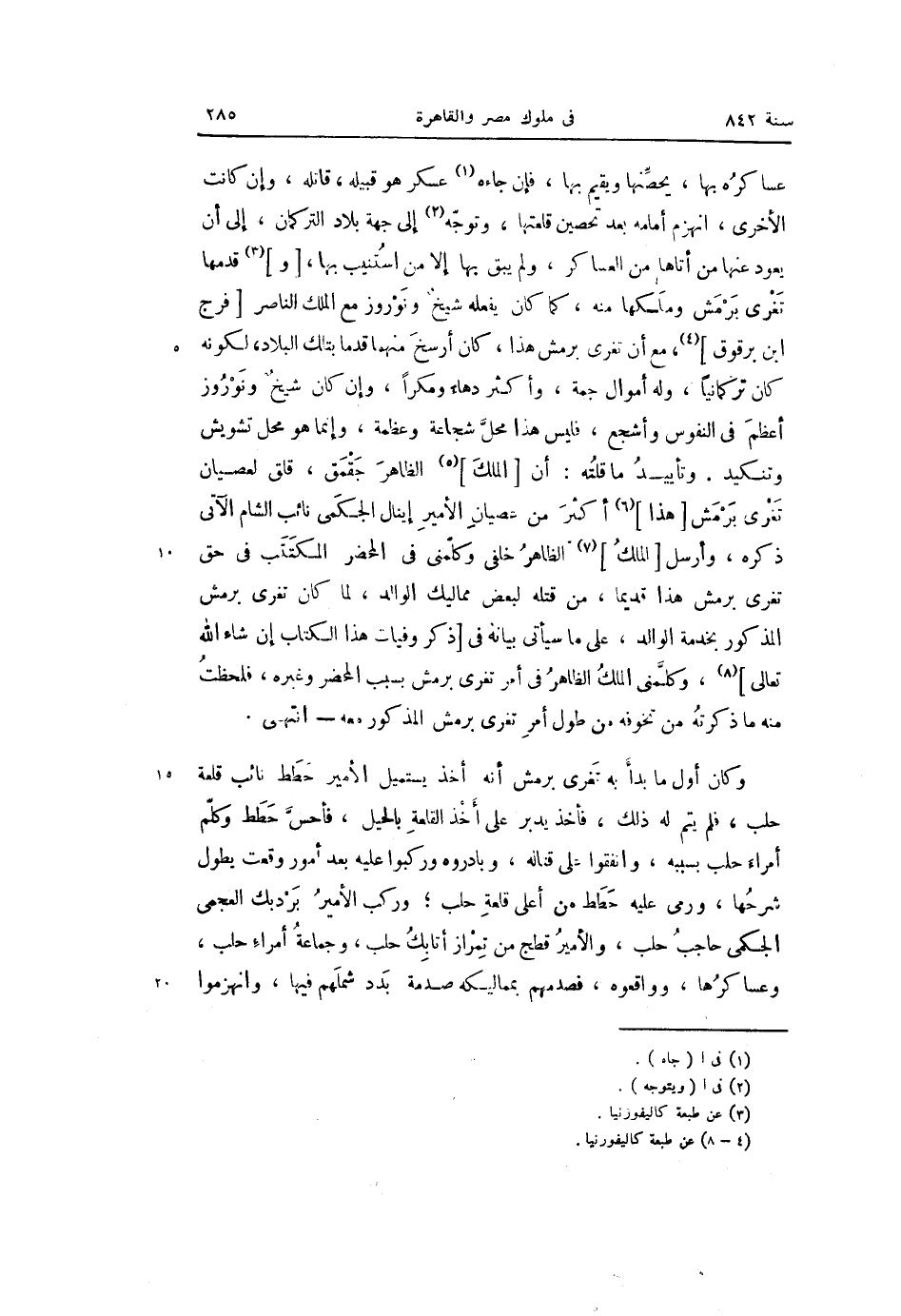 عساكره بها، يحصّنها ويقيم بها، فإن جاءه «1» عسكر هو قبيله، قاتله، وإن كانت الأخرى، انهزم أمامه بعد تحصين قامتها، وتوجّه «2» إلى جهة بلاد التركمان، إلى أن يعود عنها من أتاها من العساكر، ولم يبق بها إلا من استنيب بها، [و] «3» قدمها تغرى برمش وملكها منه، كما كان يفعله شيخ ونوروز مع الملك الناصر [فرج ابن برقوق] «4» ، مع أن تغرى برمش هذا، كان أرسخ منهما قدما بتلك البلاد، لكونه كان تركمانيا، وله أموال جمة، وأكثر دهاء ومكرا، وإن كان شيخ ونوروز أعظم فى النفوس وأشجع، فليس هذا محلّ شجاعة وعظمة، وإنما هو محل تشويش وتنكيد. وتأييد ما قلته: أن [الملك] «5» الظاهر جقمق، قلق لعصيان تغرى برمش [هذا] «6» أكثر من عصيان الأمير إينال الجكمى نائب الشام الآتى ذكره، وأرسل [الملك] «7» الظاهر خلفى وكلّمنى فى المحضر المكتتب فى حق تغرى برمش هذا قديما، من قتله لبعض مماليك الوالد، لما كان تغرى برمش المذكور بخدمة الوالد، على ما سيأتى بيانه فى [ذكر وفيات هذا الكتاب إن شاء الله تعالى] «8» ، وكلّمنى الملك الظاهر فى أمر تغرى برمش بسبب المحضر وغيره، فلحظت منه ما ذكرته من تخوفه من طول أمر تغرى برمش المذكور معه- انتهى.