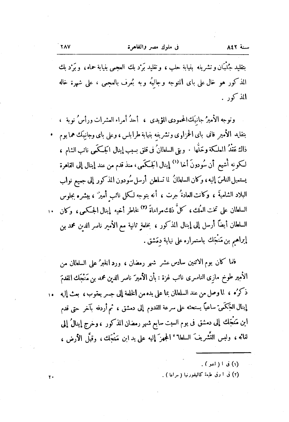 وتوجه الأمير جانبك المحمودى المؤيدى، أحد أمراء العشرات ورأس نوبة، بتقليد الأمير قانى باى الحمزاوى وتشريفه بنيابة طرابلس، وعلى باى وجانبك هما يوم ذاك عقد المملكة وحلّها. وبقى السلطان فى قلق بسبب إينال الجكمى نائب الشام، لكونه أشيع أن سودون أخا «1» إينال الجكمى، منذ قدم من عند إينال إلى القاهرة يستميل الناس إليه، وكان السلطان لما تسلطن أرسل سودون المذكور إلى جميع نواب البلاد الشامية، وكانت العادة جرت، أنه يتوجه لكل نائب أمير، يبشره بجلوس السلطان على تخت الملك، كلّ ذلك مراعاة «2» لخاطر أخيه إينال الجكمى، وكان السلطان أيضا أرسل إلى إينال المذكور، بخلعة ثانية مع الأمير ناصر الدين محمد بن إبراهيم بن منجك باستمراره على نيابة دمشق.
