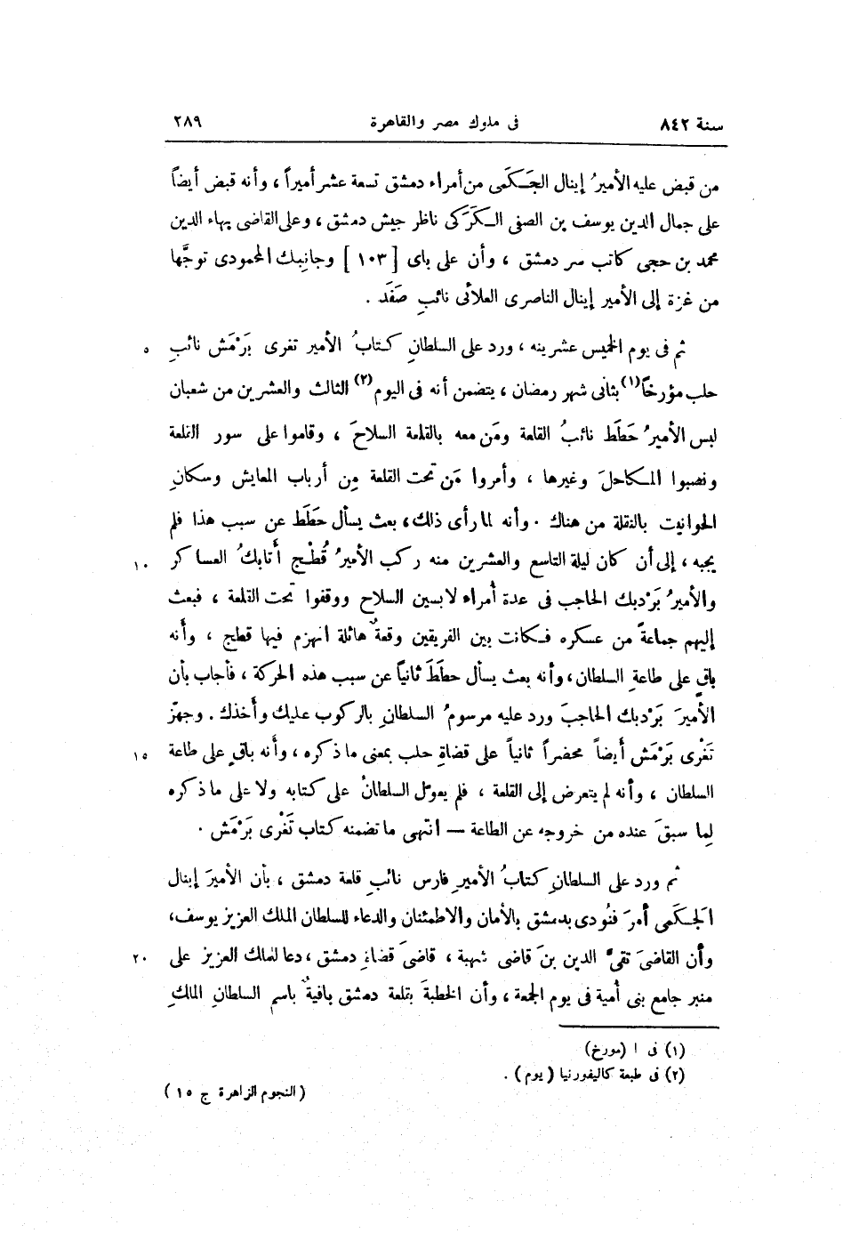 ثم فى يوم الخميس عشرينه، ورد على السلطان كتاب الأمير تغرى برمش نائب حلب مؤرخا «1» بثانى شهر رمضان، يتضمن أنه فى اليوم «2» الثالث والعشرين من شعبان لبس الأمير حطط نائب القلعة ومن معه بالقلعة السلاح، وقاموا على سور القلعة ونصبوا المكاحل وغيرها، وأمروا من تحت القلعة من أرباب المعايش وسكان الحوانيت بالنقلة من هناك. وأنه لما رأى ذلك، بعث يسأل حطط عن سبب هذا فلم يجبه، إلى أن كان ليلة التاسع والعشرين منه ركب الأمير قطج أتابك العساكر والأمير بردبك الحاجب فى عدة أمراء لا بسين السلاح ووقفوا تحت القلعة، فبعث إليهم جماعة من عسكره فكانت بين الفريقين وقعة هائلة انهزم فيها قطج، وأنه باق على طاعة السلطان، وأنه بعث يسأل حطط ثانيا عن سبب هذه الحركة، فأجاب بأن الأمير بردبك الحاجب ورد عليه مرسوم السلطان بالركوب عليك وأخذك. وجهزّ تغرى برمش أيضا محضرا ثانيا على قضاة حلب بمعنى ما ذكره، وأنه باق على طاعة السلطان، وأنه لم يتعرض إلى القلعة، فلم يعوّل السلطان على كتابه ولا على ما ذكره لما سبق عنده من خروجه عن الطاعة- انتهى ما تضمنه كتاب تغرى برمش.