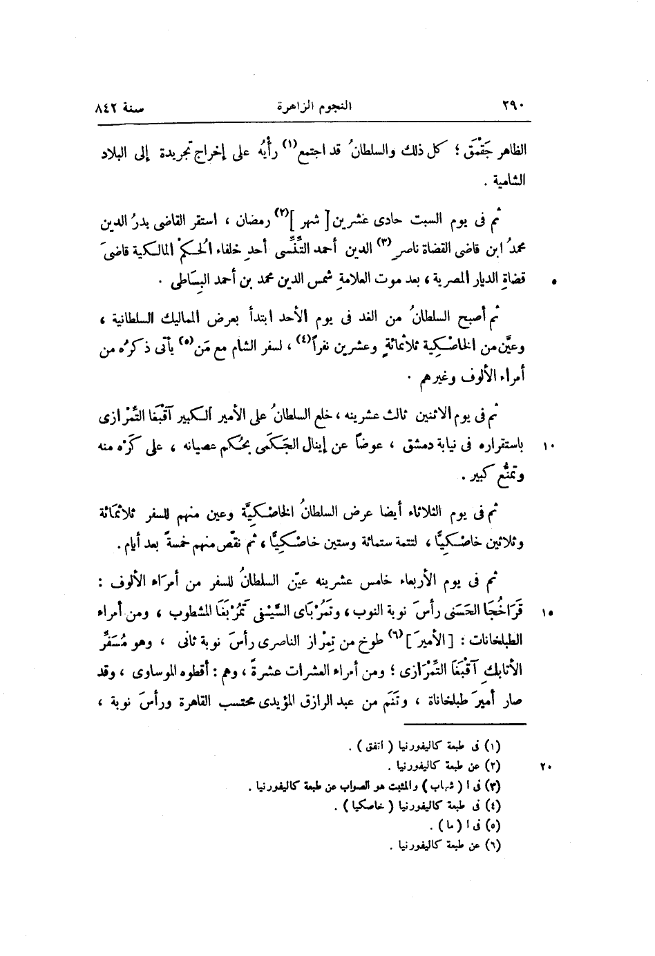 ثم أصبح السلطان من الغد فى يوم الأحد ابتدأ بعرض المماليك السلطانية، وعيّن من الخاصكية ثلاثمائة وعشرين نفرا «4» ، لسفر الشام مع من «5» يأتى ذكره من أمراء الألوف وغيرهم.
