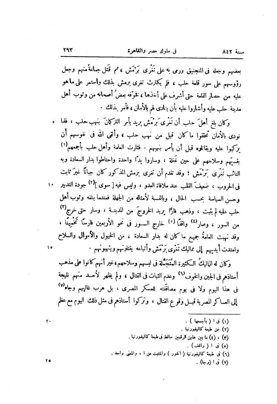 وكان بلغ أهل حلب أن تغرى برمش يريد يأمر التركمان بنهب حلب، فلما نودى بالأمان تحققوا ما كان قيل من نهب حلب، وألقى الله فى نفوسهم أن يركبوا عليه ويقاتلوه قبل أن يأمر بنهبهم. فثارت العامة وأهل حلب بأجمعهم «1» بقسيّهم وسلاحهم على حين غفلة، وساروا يدا واحدة واحتاطوا بدار السعادة وبه النائب تغرى برمش؛ وقد تقدم أن تغرى برمش المذكور كان جبانا غير ثابت فى الحروب، ضعيف القلب عند ملاقاة العدو، وليس فيه [سوى] «2» جودة التدبير وحسن السياسة بحسب الحال، وبالنسبة لأمثاله من الجهلة فعندما بلغه وثوب أهل حلب عليه لم يثبت، وذهب فارّا يريد الخروج من المدينة، وسار حتى خرج «3» من السور، وصار «4» واقفا «5» خارج السور فى نحو الأربعين فارسا تخمينا، وقد نهبت العامة جميع ما كان له بدار السعادة، من الخيول والأموال والسلاح وامتدت أيديهم إلى مماليك تغرى برمش وأتباعه يقتلونهم وينهبونهم.