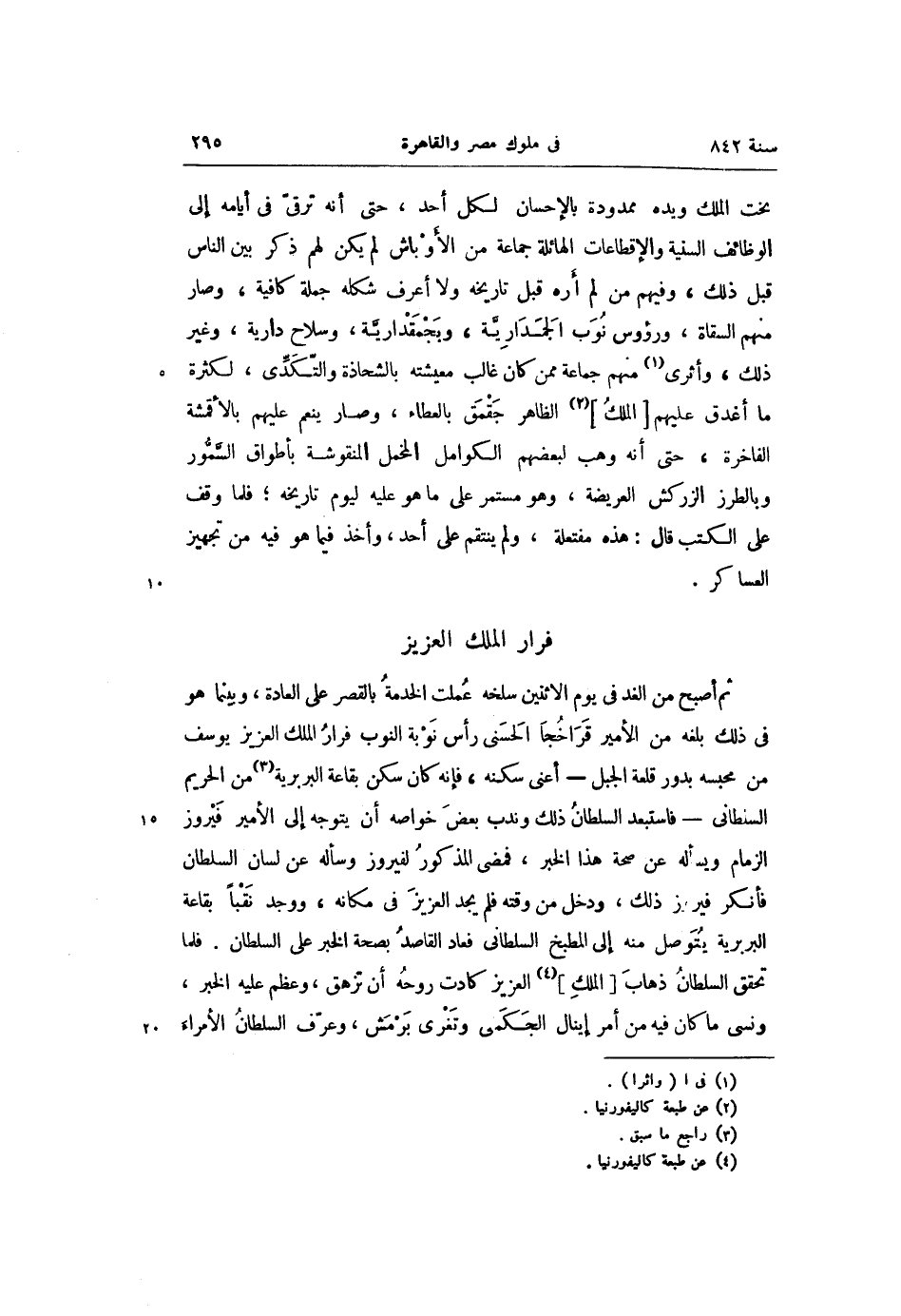 ثم أصبح من الغد فى يوم الاثنين سلخه عملت الخدمة بالقصر على العادة، وبينما هو فى ذلك بلغه من الأمير قراخجا الحسنى رأس نوبة النوب فرار الملك العزيز يوسف من محبسه بدور قلعة الجبل- أعنى سكنه، فإنه كان سكن بقاعة البربرية «3» من الحريم السلطانى- فاستبعد السلطان ذلك وندب بعض خواصه أن يتوجه إلى الأمير فيروز الزمام ويسأله عن صحة هذا الخبر، فمضى المذكور لفيروز وسأله عن لسان السلطان فأنكر فيروز ذلك، ودخل من وقته فلم يجد العزيز فى مكانه، ووجد نقبا بقاعة البربرية يتوصل منه إلى المطبخ السلطانى فعاد القاصد بصحة الخبر على السلطان. فلما تحقق السلطان ذهاب [الملك] «4» العزيز كادت روحه أن تزهق، وعظم عليه الخبر، ونسى ما كان فيه من أمر إينال الجكمى وتغرى برمش، وعرّف السلطان الأمراء