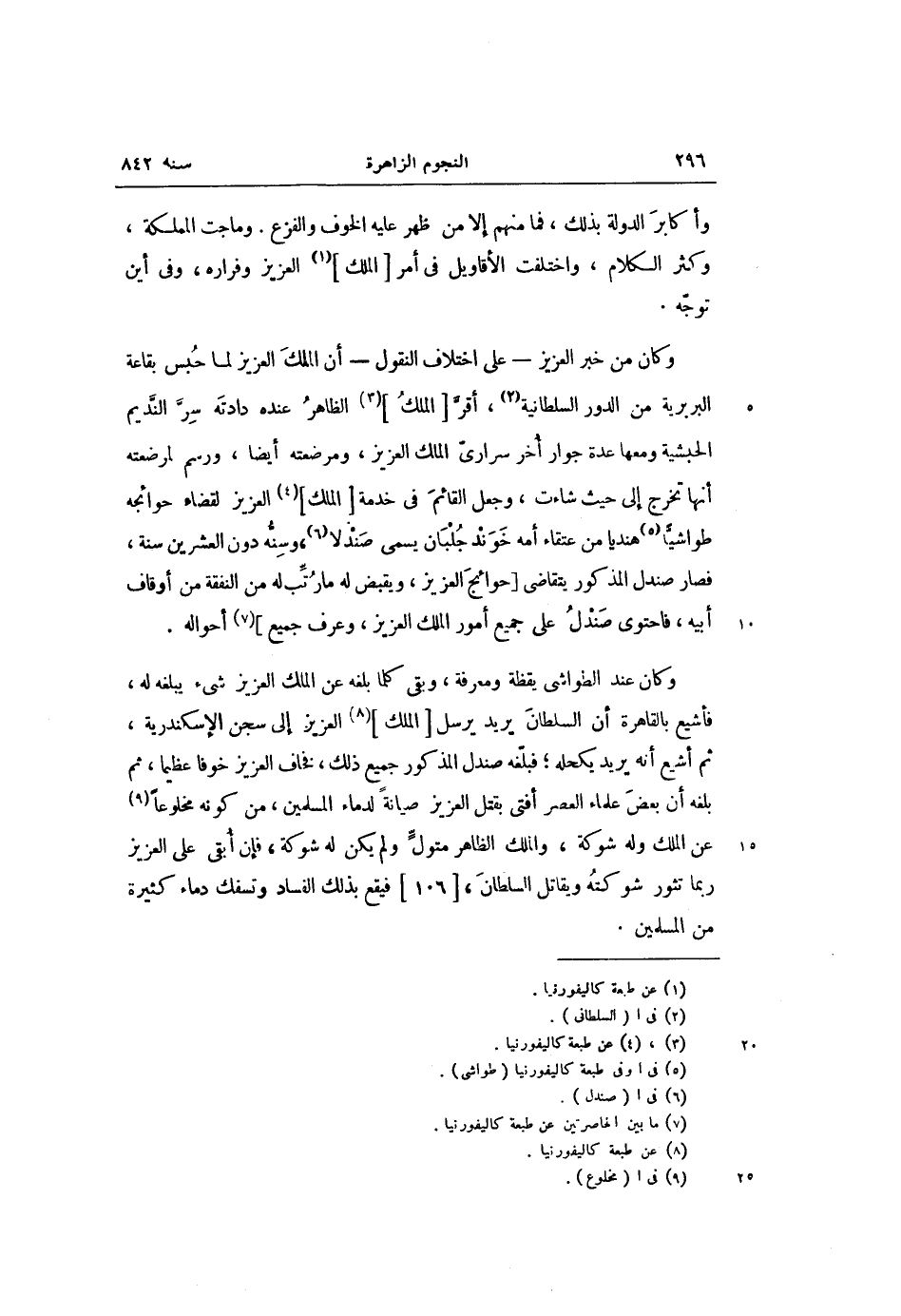 هنديا من عتقاء أمه خوند جلبان يسمى صندلا «6» ، وسنّه دون العشرين سنة، فصار صندل المذكور يتقاضى [حوائج العزيز، ويقبض له ما رتّب له من النفقة من أوقاف أبيه، فاحتوى صندل على جميع أمور الملك العزيز، وعرف جميع] «7» أحواله.