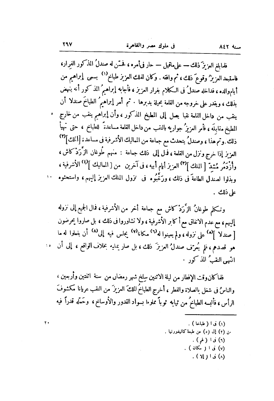 وتكلم طوغان الزّردكاش مع جماعة أخر من الأشرفية، فمال الجميع إلى نزوله إليهم، مع عدم الاتفاق مع أكابر الأشرفية، ولا تشاوروا فى ذلك، بل صاروا يحرضون [صندلا] «5» على نزوله، ولم يعينوا له «6» مكانا «7» يجلس فيه إلى «8» أن يفعلوا له ما هو قصدهم، فلم يعرّف صندل العزيز ذلك، بل صار يمليه بخلاف الواقع، إلى أن انتهى النقب المذكور.