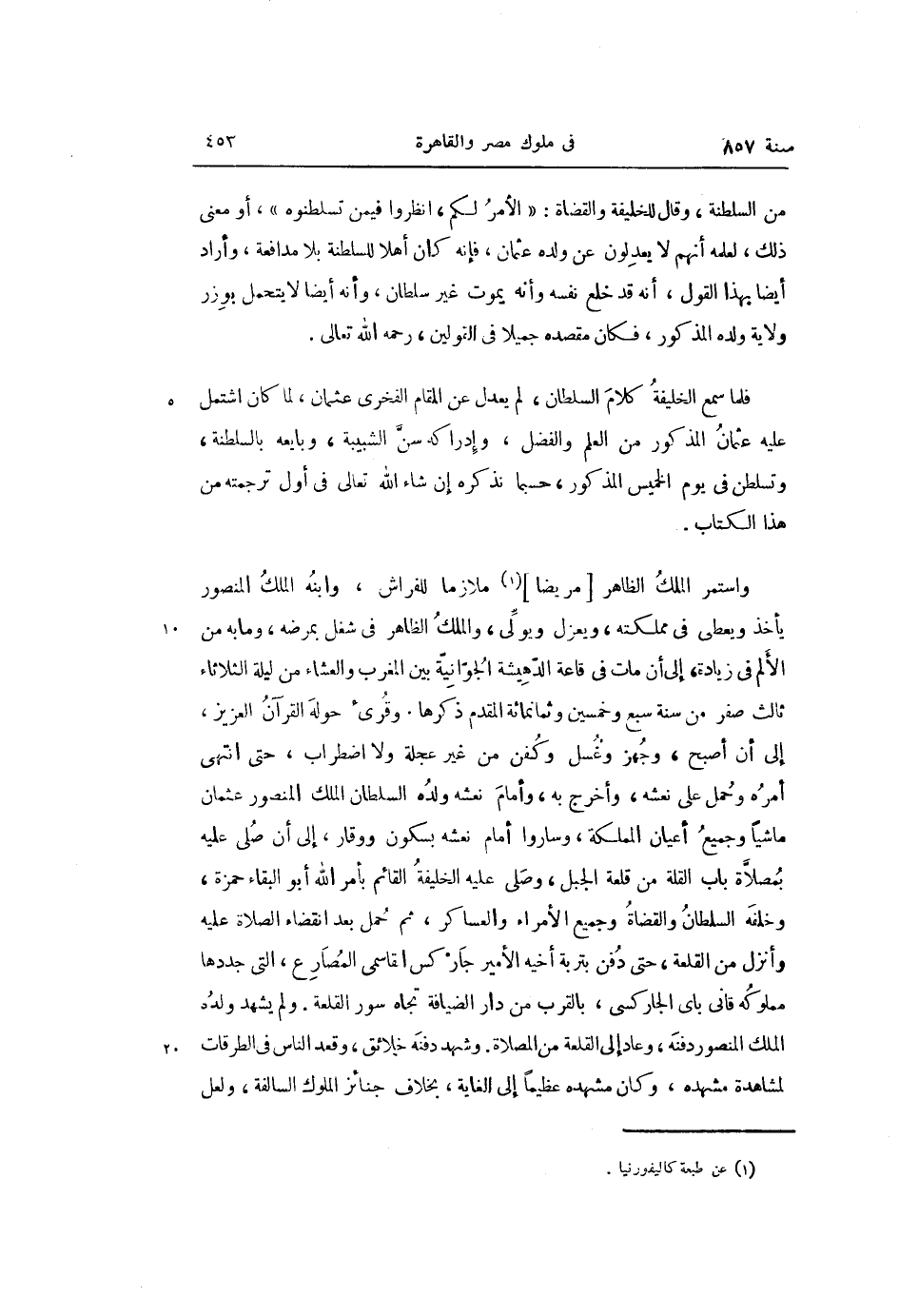 فلما سمع الخليفة كلام السلطان، لم يعدل عن المقام الفخرى عثمان، لما كان اشتمل عليه عثمان المذكور من العلم والفضل، وإدراكه سنّ الشبيبة، وبايعه بالسلطنة، وتسلطن فى يوم الخميس المذكور، حسبما نذكره إن شاء الله تعالى فى أول ترجمته من هذا الكتاب.