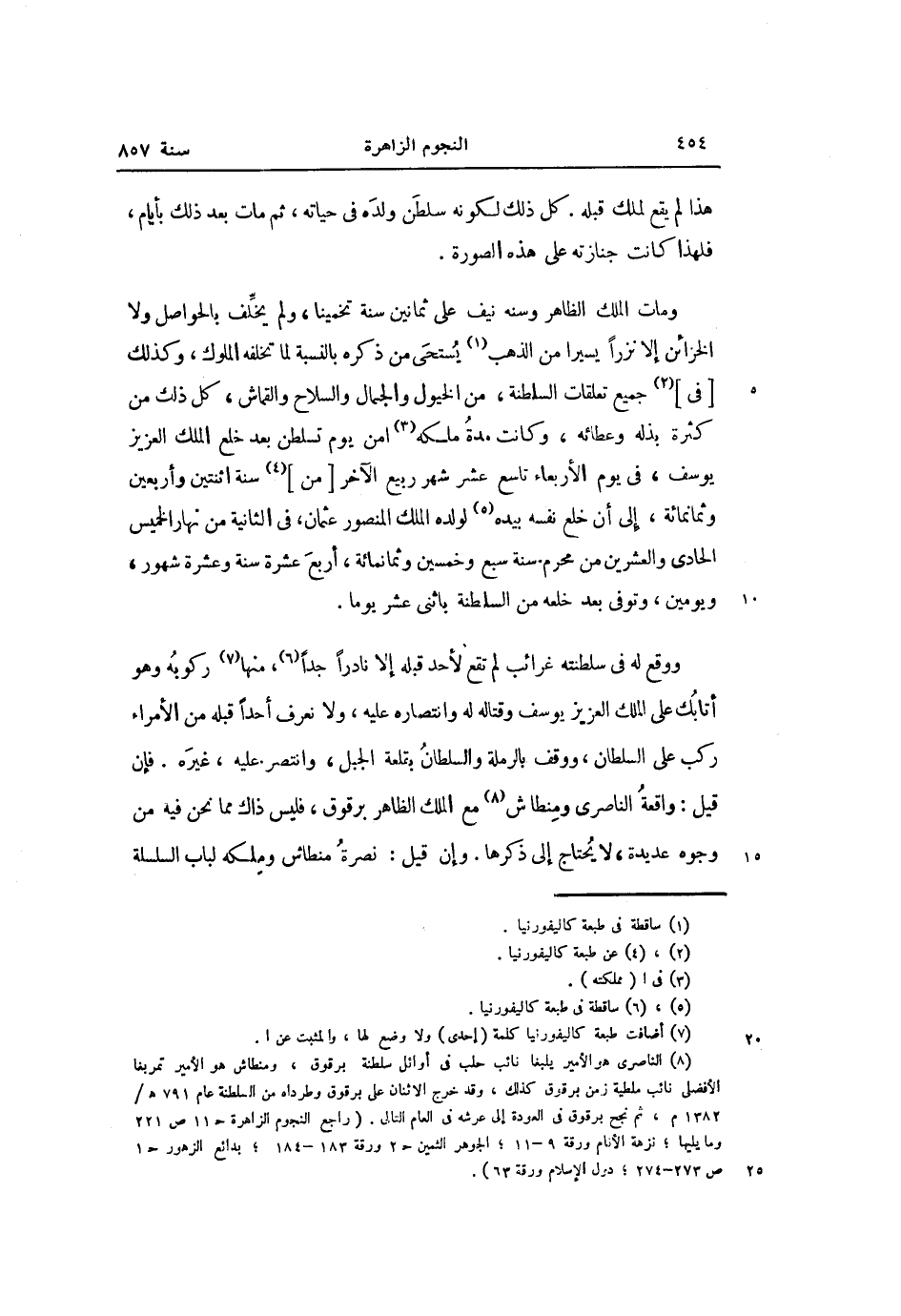 ووقع له فى سلطنته غرائب لم تقع لأحد قبله إلا نادرا جدا «6» ، منها «7» ركوبه وهو أتابك على الملك العزيز يوسف وقتاله له وانتصاره عليه، ولا نعرف أحدا قبله من الأمراء ركب على السلطان، ووقف بالرملة والسلطان بقلعة الجبل، وانتصر عليه، غيره. فإن قيل: واقعة الناصرى ومنطاش «8» مع الملك الظاهر برقوق، فليس ذاك مما نحن فيه من وجوه عديدة، لا يحتاج إلى ذكرها. وإن قيل: نصرة منطاش وملكه لباب السلسلة