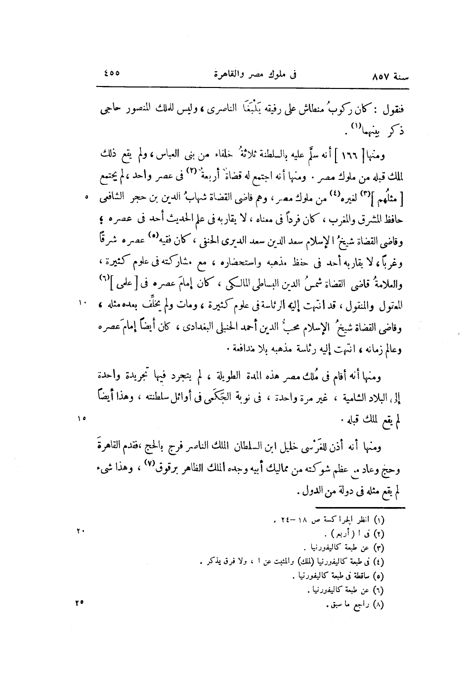 ومنها [166] أنه سلّم عليه بالسلطنة ثلاثة خلفاء من بنى العباس، ولم يقع ذلك لملك قبله من ملوك مصر. ومنها أنه اجتمع له قضاة أربعة «2» فى عصر واحد، لم يجتمع [مثلهم] «3» لغيره «4» من ملوك مصر، وهم قاضى القضاة شهاب الدين بن حجر الشافعى حافظ المشرق والمغرب، كان فردا فى معناه، لا يقاربه فى علم الحديث أحد فى عصره؛ وقاضى القضاة شيخ الإسلام سعد الدين سعد الديرى الحنفى، كان فقيه «5» عصره شرقا وغربا، لا يقاربه أحد فى حفظ مذهبه واستحضاره، مع مشاركته فى علوم كثيرة، والعلامة قاضى القضاة شمس الدين البساطى المالكى، كان إمام عصره فى [علمى] «6» المعقول والمنقول، قد انتهت إليه الرئاسة فى علوم كثيرة، ومات ولم يخلّف بعده مثله، وقاضى القضاة شيخ الإسلام محبّ الدين أحمد الحنبلى البغدادى، كان أيضا إمام عصره وعالم زمانه، انتهت إليه رئاسة مذهبه بلا مدافعة.