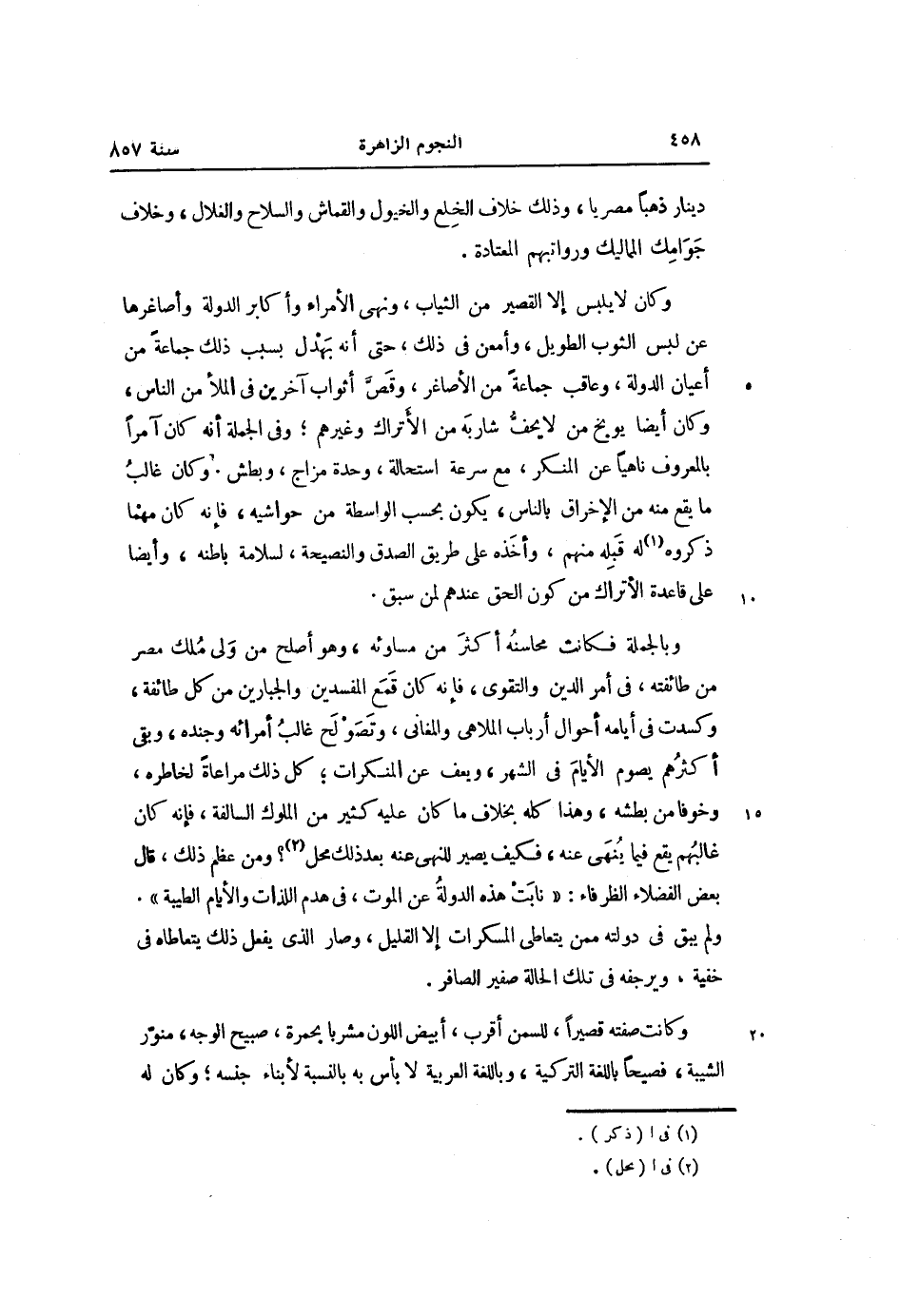 وبالجملة فكانت محاسنه أكثر من مساوئه، وهو أصلح من ولى ملك مصر من طائفته، فى أمر الدين والتقوى، فإنه كان قمع المفسدين والجبارين من كل طائفة، وكسدت فى أيامه أحوال أرباب الملاهى والمغانى، وتصولح غالب أمرائه وجنده، وبقى أكثرهم يصوم الأيام فى الشهر، ويعف عن المنكرات؛ كل ذلك مراعاة لخاطره، وخوفا من بطشه، وهذا كله بخلاف ما كان عليه كثير من الملوك السالفة، فإنه كان غالبهم يقع فيما ينهى عنه، فكيف يصير للنهى عنه بعد ذلك محل «2» ؟ ومن عظم ذلك، قال بعض الفضلاء الظرفاء: «نابت هذه الدولة عن الموت، فى هدم اللذات والأيام الطيبة» .
